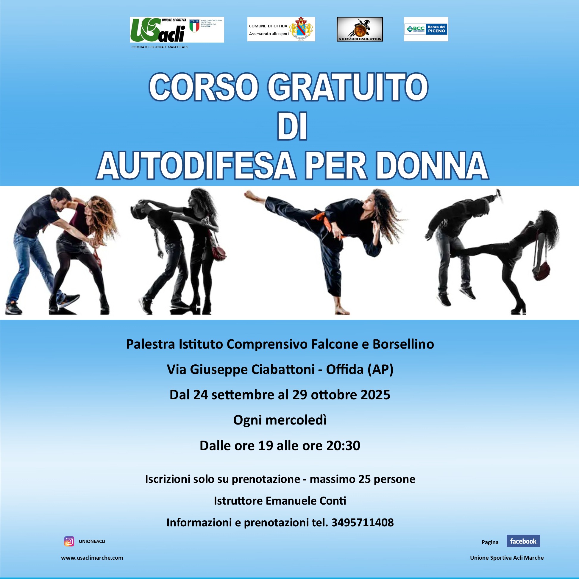 OFFIDA – Sono ancora aperte le iscrizioni al corso gratuito di autodifesa per donne che si svolgerà presso la palestra dell’Istituto Comprensivo Falcone e Borsellino in via Giuseppe Ciabattoni a Offida.