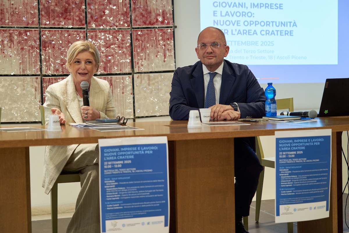 ASCOLI PICENO – Si è svolto IERI ad Ascoli Piceno il convegno “Giovani, imprese e lavoro: nuove opportunità per il cratere”, con la partecipazione del Ministro del Lavoro e delle Politiche Sociali, Marina Calderone, e del commissario straordinario sisma 2016. L’iniziativa, organizzata insieme alla Camera di Commercio Marche e all’Ordine dei consulenti del lavoro, ha visto la partecipazione del presidente della Camera di Commercio Marche Gino Sabatini, dell’esperto della struttura commissariale Romano Benini, del Vicepresidente della Camera di Commercio Marche, Massimiliano Polacco, del dirigente USR Marche, Chiara Ercoli, e del consigliere dell’Ordine dei consulenti del lavoro,Carla Capriotti.