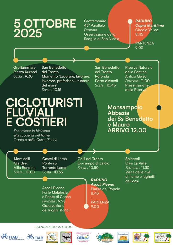 Co-organizzato dai CEA “Torre sul Porto” del Comune di San Benedetto del Tronto, “Ambiente e Mare”, “Giano”, “La Contea”, “Asa Speleoclub”, “Rifugio Escursionistico Mario Paci” e “Oasi La Valle” con l’importante contributo dei volontari delle Sezioni FIAB (Federazione Italiana Ambiente e Bicicletta) di Ascoli Piceno e San Benedetto del Tronto, l’evento, aperto a tutti, ha lo scopo di far conoscere le caratteristiche ambientali del Fiume Tronto e del tratto costiero da Cupra Marittima a San Benedetto del Tronto, pedalando lungo le ciclabili e le strade.