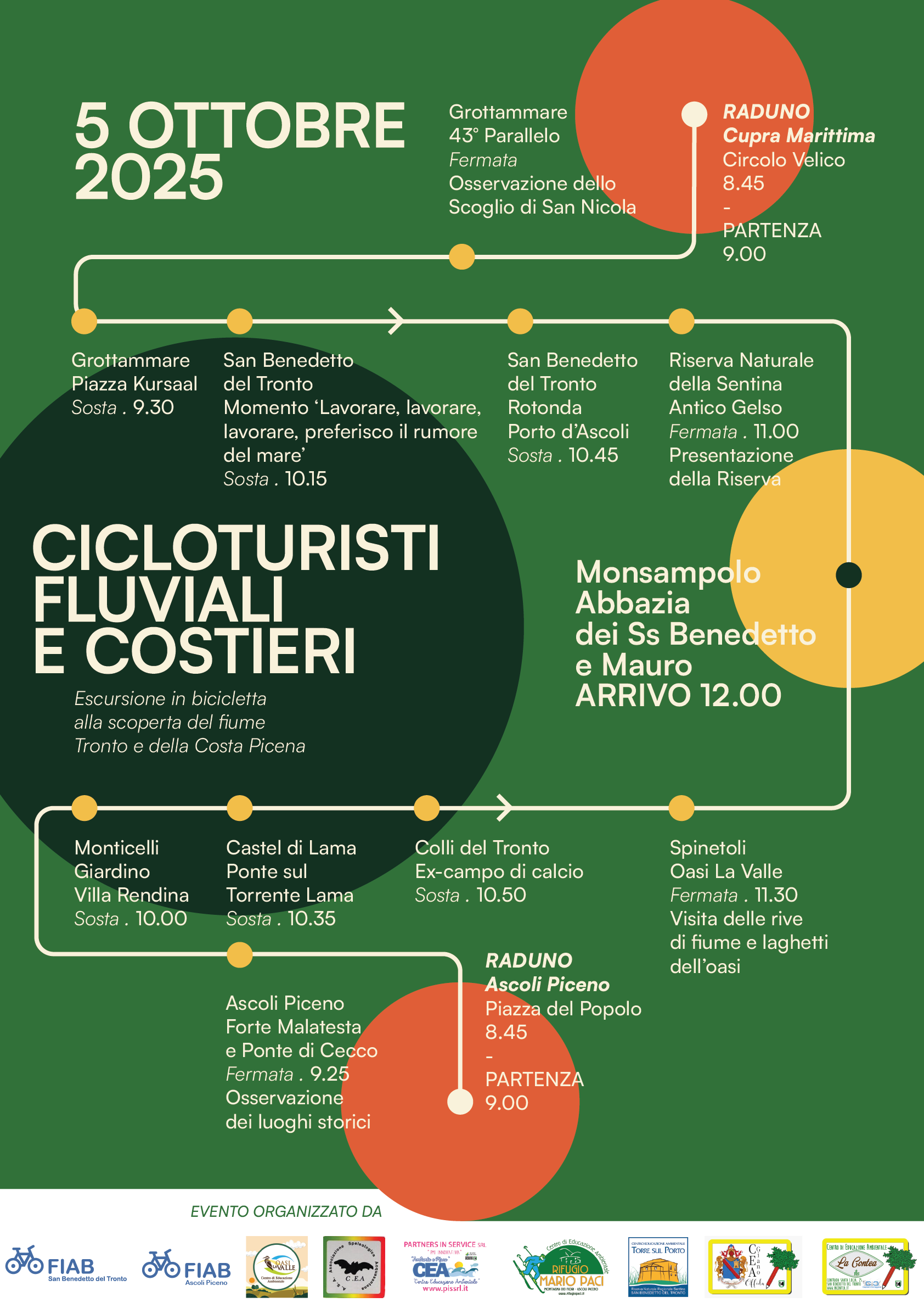 Co-organizzato dai CEA “Torre sul Porto” del Comune di San Benedetto del Tronto, “Ambiente e Mare”, “Giano”, “La Contea”, “Asa Speleoclub”, “Rifugio Escursionistico Mario Paci” e “Oasi La Valle” con l’importante contributo dei volontari delle Sezioni FIAB (Federazione Italiana Ambiente e Bicicletta) di Ascoli Piceno e San Benedetto del Tronto, l’evento, aperto a tutti, ha lo scopo di far conoscere le caratteristiche ambientali del Fiume Tronto e del tratto costiero da Cupra Marittima a San Benedetto del Tronto, pedalando lungo le ciclabili e le strade.