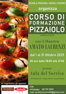 ASCOLI PICENO – All’Aula del Sorriso di Ascoli Piceno prende il via un nuovo percorso formativo dedicato all’arte della pizza. La Scuola per pizzaioli, in collaborazione con l’Associazione benefica no-profit Aula del Sorriso, organizza un corso di 30 ore che si terrà dal 1° al 31 ottobre 2025, con lezioni in programma ogni sera dalle 18.00 alle 21.00.