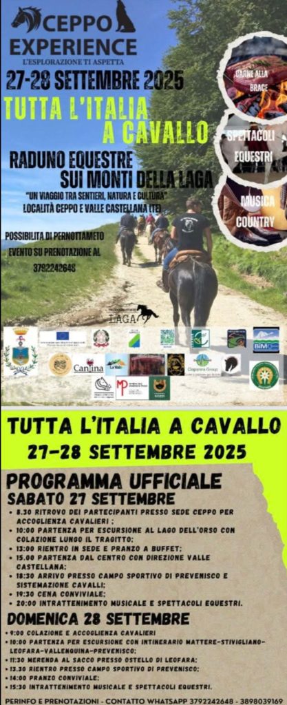 VALLE CASTELLANA – Sabato 27 e domenica 28 settembre il Comune di Valle Castellana, in collaborazione con l’Associazione Ceppo Experience, organizza un evento dedicato agli amanti della natura, dei cavalli e delle tradizioni locali. Due giornate ricche di emozioni tra passeggiate a cavallo, spettacoli equestri, musica dal vivo e stand enogastronomici.