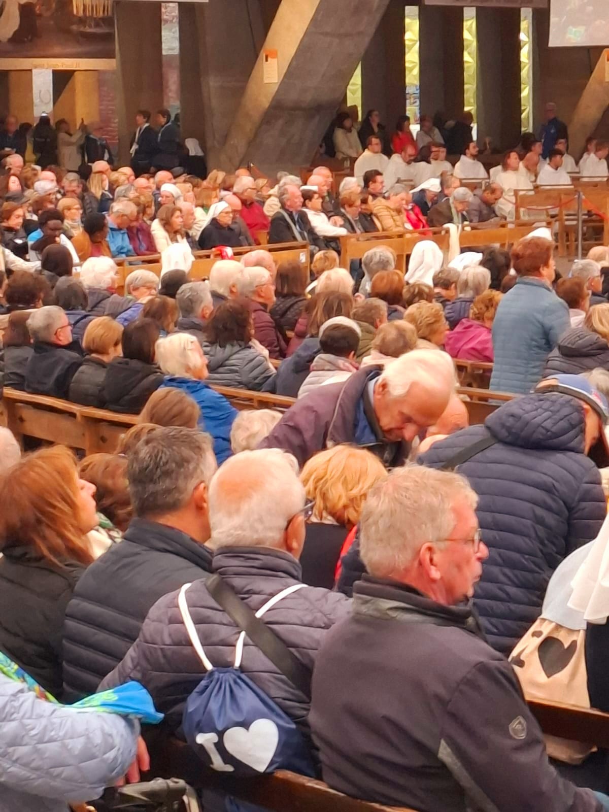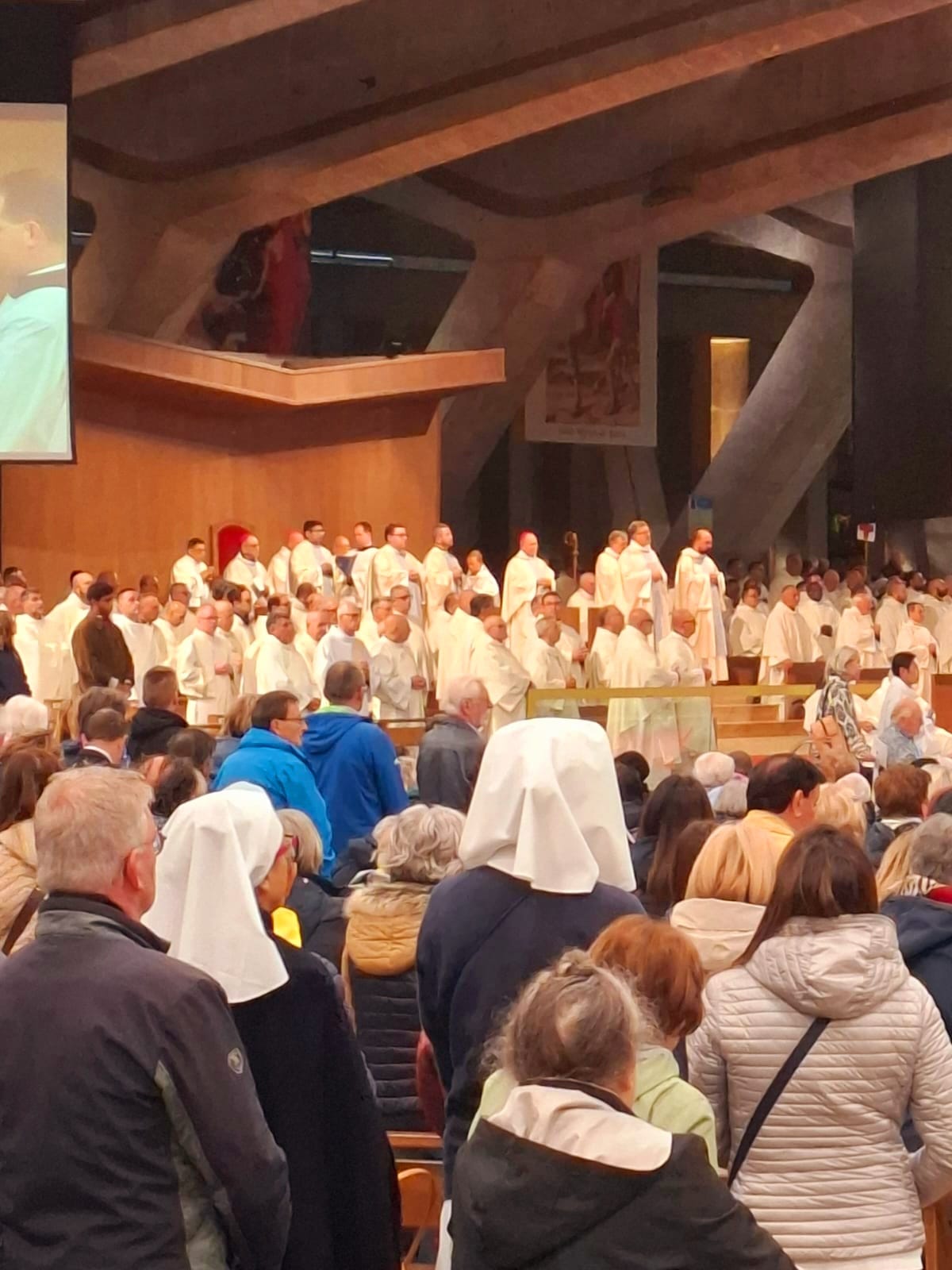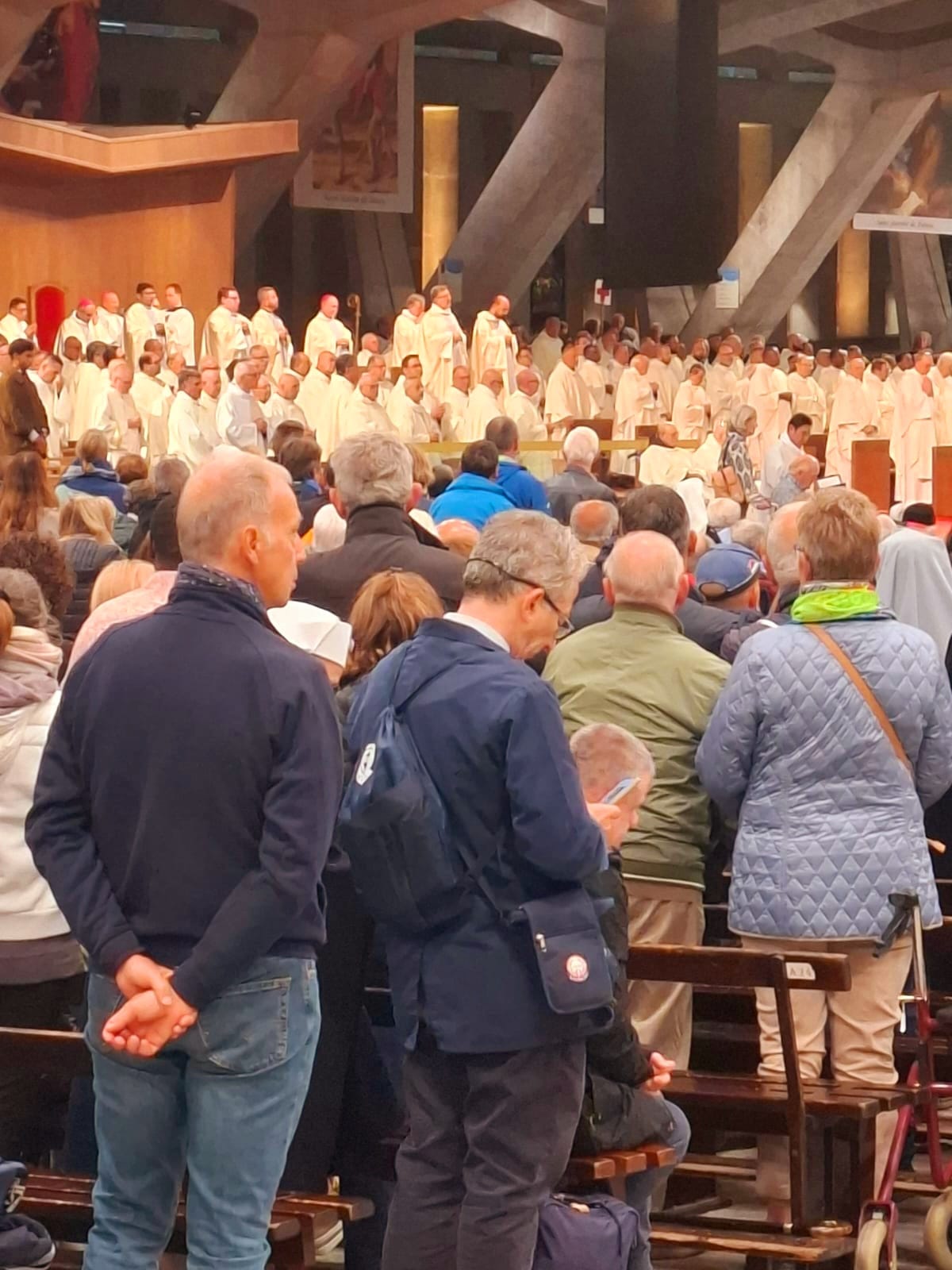 Racconta mons. Catani: “Il primo momento da incorniciare è stato quello vissuto nella Grande Basilica sotterranea di San Pio X, dove abbiamo celebrato la Messa internazionale, detta in tutte le lingue dei pellegrini. L’edificio sacro è immenso, può ospitare anche 8mila persone. Ieri, più della metà dello spazio era occupato da noi Italiani, che eravamo oltre 4mila, ma abbiamo incontrato anche pellegrini che venivano dalla Polonia, dalla Croazia, dall’Irlanda, dalla Spagna, dalla Macedonia, dalla Corea, dal Giappone, dal Camerun, dal Madagascar, dal Perù e da altri Paesi dell’America Latina. La Messa è stata concelebrata da circa 200 sacerdoti ed è stata ancora una volta presieduta dal vescovo di Fermo, mons. Rocco Pennacchio, che è l’assistente nazionale. Inoltre è stata celebrata in tutte le lingue: il Vangelo in italiano, perché ha maggior parte delle persone presenti erano italiane, ma le varie letture sono state lette in spagnolo, tedesco, inglese, polacco e persino una lingua orientale che non sono riuscito a capire se fosse cinese, giapponese o forse coreano, e addirittura anche un accenno di arabo. Abbiamo proprio vissuto l’universalità della Chiesa: persone diverse che parlano lingue diverse, ma unite dalla stessa fede nello stesso Padre Nostro, nella stessa devozione alla Vergine Maria. La stessa intensità di fraternità, la stessa preghiera corale. Questo è il bello della Messa internazionale! Una Messa gloriosa, cattolica, nel senso vero della parola! Cattolico, infatti, in lingua greca vuol dire universale. Una Messa, dunque, di una universalità stupenda! Terminata la Celebrazione, tutti insieme – sacerdoti, vescovi e il restante popolo santo di Dio – siamo andati in pellegrinaggio alla grotta dalla Basilica di San Pio X, dove abbiamo recitato l’Angelus e poi la benedizione”.