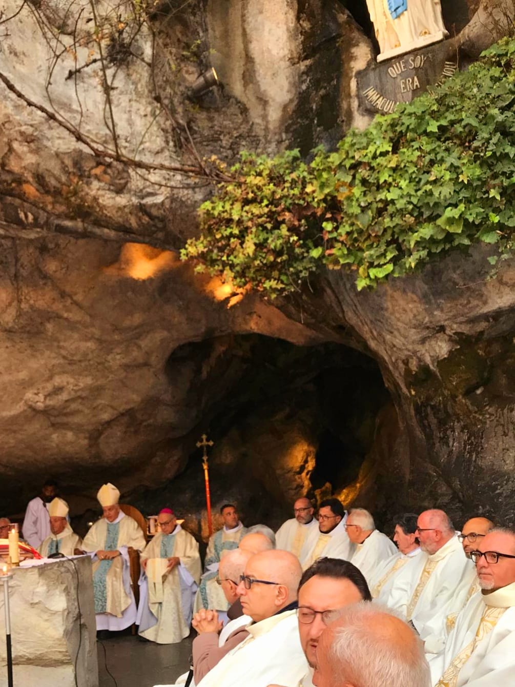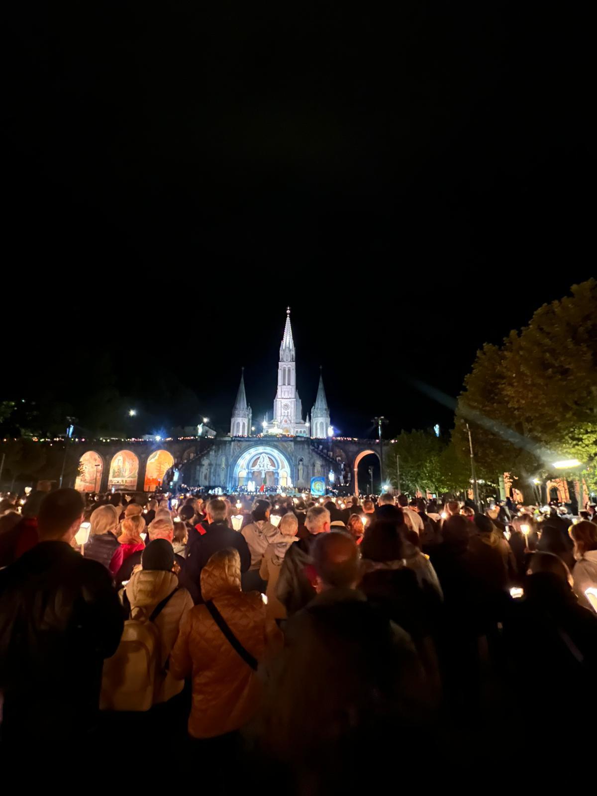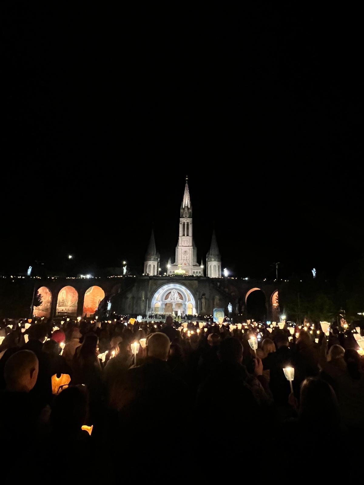 Conclude mons. Catani: “L’ultimo momento meraviglioso della giornata è stata la processione mariana con i flambeaux che si è svolta alle ore 21:00. È stato veramente emozionante vedere il buio della notte squarciato da questa processione di luce! Parlo chiaramente della luce della fede del cristiano, la fede battesimale, questa luce che penetra la notte e la illumina: è il simbolo della vittoria, della fede, dell’amore, della speranza su tutti i nostri turbamenti, sulle nostre incertezze, sulle nostre piccole e grandi miserie. Abbiamo trascorso la serata a camminare sull’Esplanade du Rosaire, l’ampia area panoramica e pedonale del Santuario di Nostra Signora di Lourdes, accessibile dalla Porta Saint Michel. Qui ci siamo riuniti per pregare il Rosario, cantando le lodi di Maria e del Signore, con tutto questo popolo in cammino, nella notte, una notte molto buia, ma illuminata dalla fiaccola della fede. Bellissimo!
