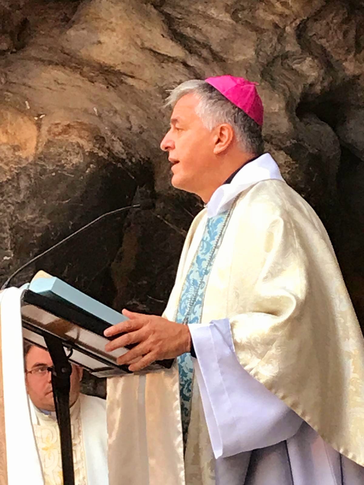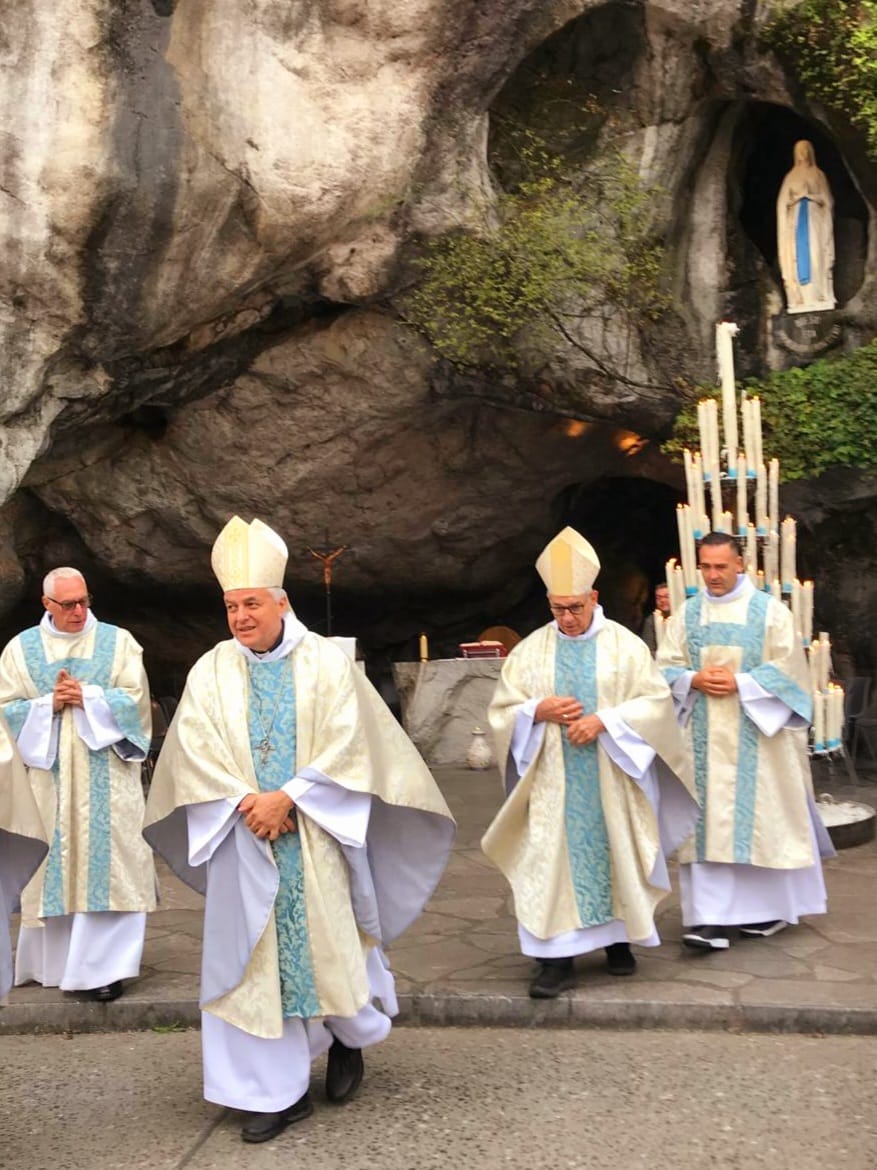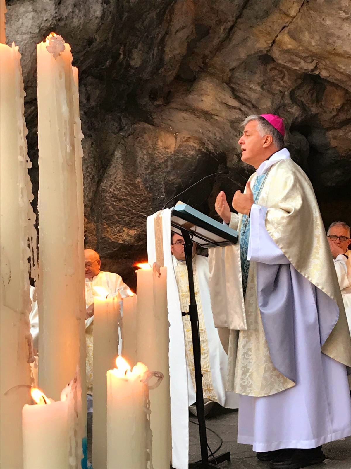 Conclude mons. Catani: “L’ultimo momento meraviglioso della giornata è stata la processione mariana con i flambeaux che si è svolta alle ore 21:00. È stato veramente emozionante vedere il buio della notte squarciato da questa processione di luce! Parlo chiaramente della luce della fede del cristiano, la fede battesimale, questa luce che penetra la notte e la illumina: è il simbolo della vittoria, della fede, dell’amore, della speranza su tutti i nostri turbamenti, sulle nostre incertezze, sulle nostre piccole e grandi miserie. Abbiamo trascorso la serata a camminare sull’Esplanade du Rosaire, l’ampia area panoramica e pedonale del Santuario di Nostra Signora di Lourdes, accessibile dalla Porta Saint Michel. Qui ci siamo riuniti per pregare il Rosario, cantando le lodi di Maria e del Signore, con tutto questo popolo in cammino, nella notte, una notte molto buia, ma illuminata dalla fiaccola della fede. Bellissimo!