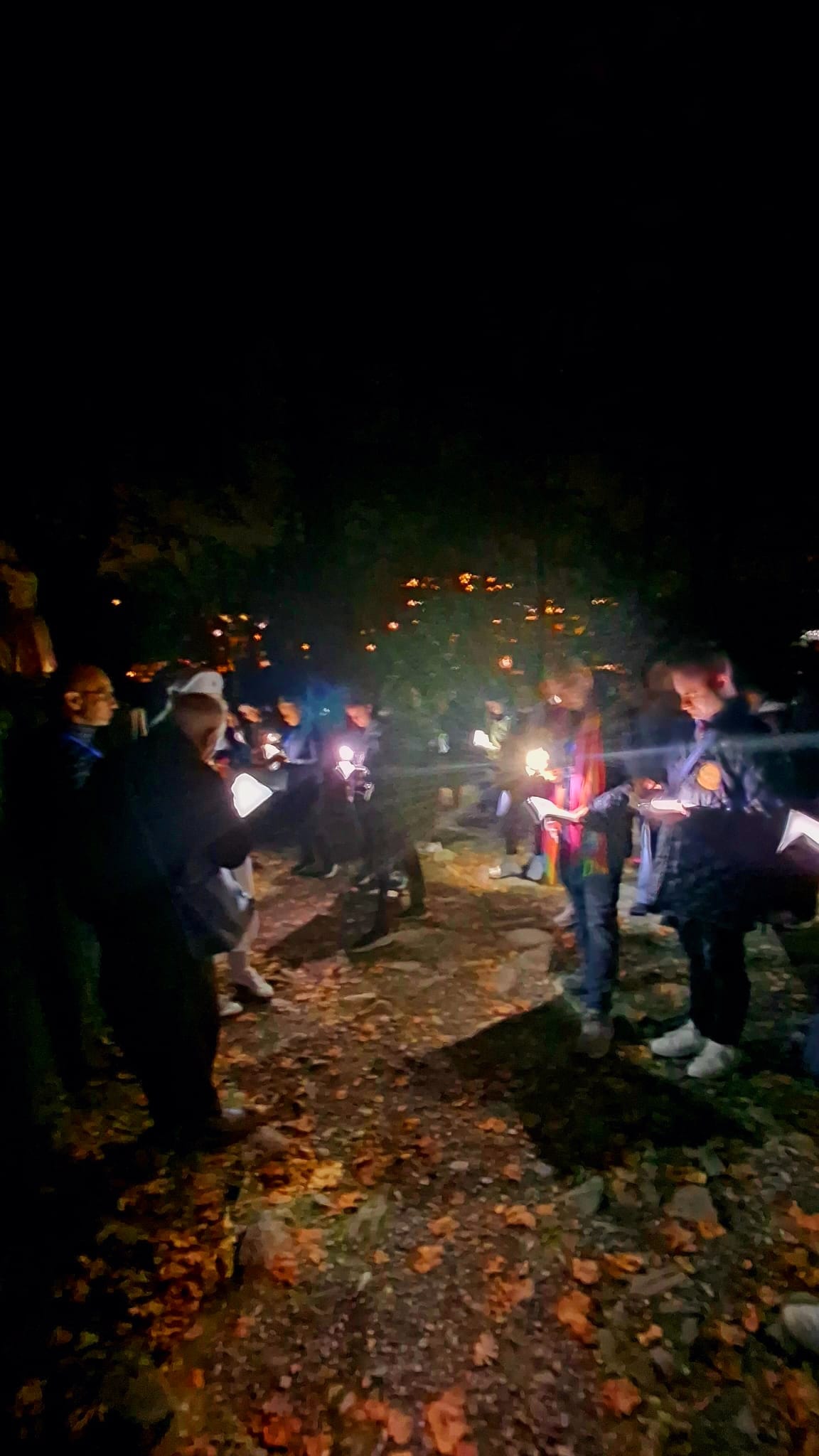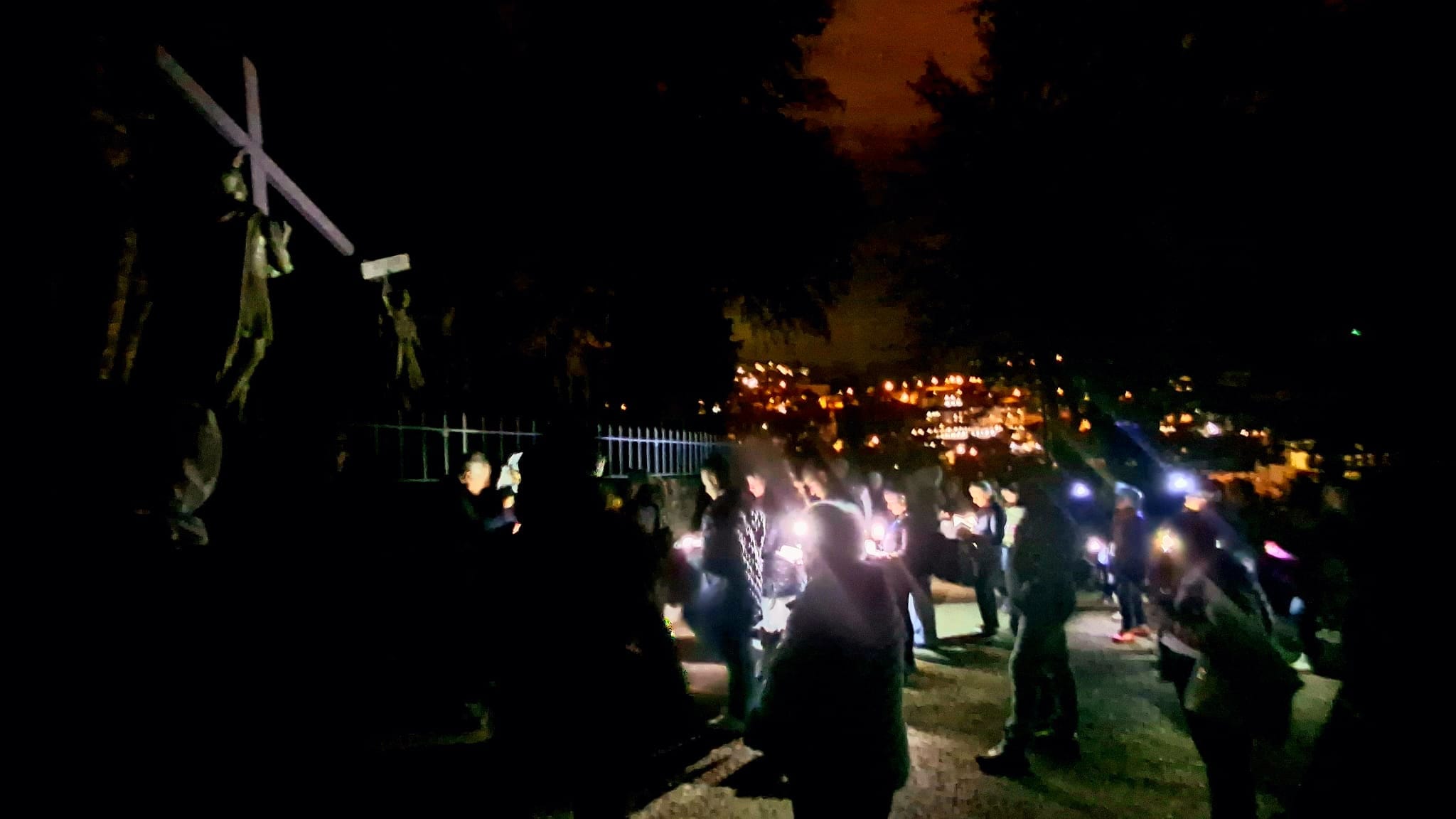 Innanzitutto ci siamo alzati molto presto. Alle ore 6:00 eravamo già a fare la Via Crucis sul monte. Eravamo un bel gruppo di circa 60 persone ed abbiamo vissuto una Via Crucis semplicemente meravigliosa! L’abbiamo fatta nel silenzio, con passione, intensità, partecipazione piena. Bellissima! Abbiamo iniziato che era ancora notte fonda, quindi abbiamo dovuto utilizzare le torce dei telefonini per fare luce e non inciampare nei sassi che c’erano lungo il percorso. Abbiamo terminato che iniziava appena ad albeggiare. È stato molto suggestivo avvertire l’aurora, quella luce dapprima dorata, poi rosea ed infine purpurea che è apparsa nel cielo, man mano che pregavamo. Un crescendo di intensità che è arrivato al culmine con il sorgere del sole proprio mentre eravamo all’ultima stazione della Resurrezione: come se la preghiera, un po’ alla volta, avesse illuminato i nostri cuori e alla fine la Luce del Risorto li avesse invasi.