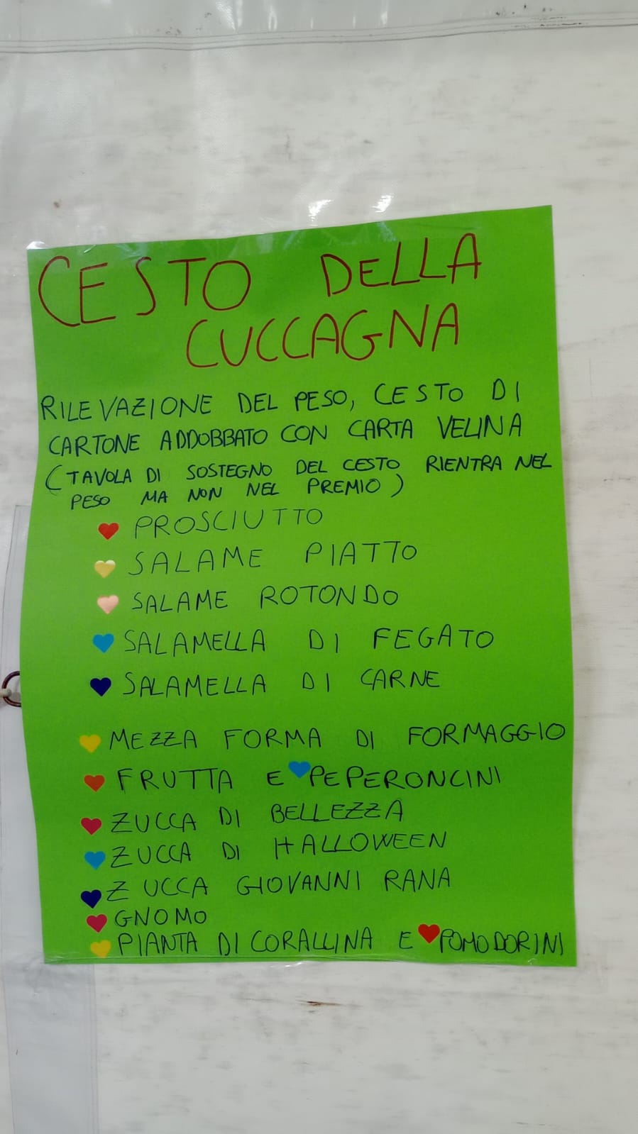 I presenti si sono divertiti partecipando a due giochi popolari: la Ruota della Fortuna e l’indovinare il peso, cercando di avvicinarsi il più possibile a quello del Cesto della Cuccagna, che poggiava su una tavola, anch’essa da considerare nel peso complessivo di 38,905 kg.