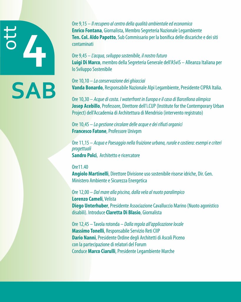 Il 4 ottobre il convegno proseguirà con una giornata dedicata a tematiche scientifiche e politiche. Il programma si aprirà con l’intervento di Luigi Di Marco, segretario generale dell’Alleanza Italiana per lo Sviluppo Sostenibile, che tratterà il tema dell’acqua come risorsa fondamentale per il futuro. Saranno poi discussi temi importanti come il cambiamento climatico, la gestione delle risorse idriche in Europa, e l’innovazione nel settore agricolo con il contributo di esperti come Josep Acebillo, direttore dell’Istituto di Urbanistica Contemporanea di Barcellona.