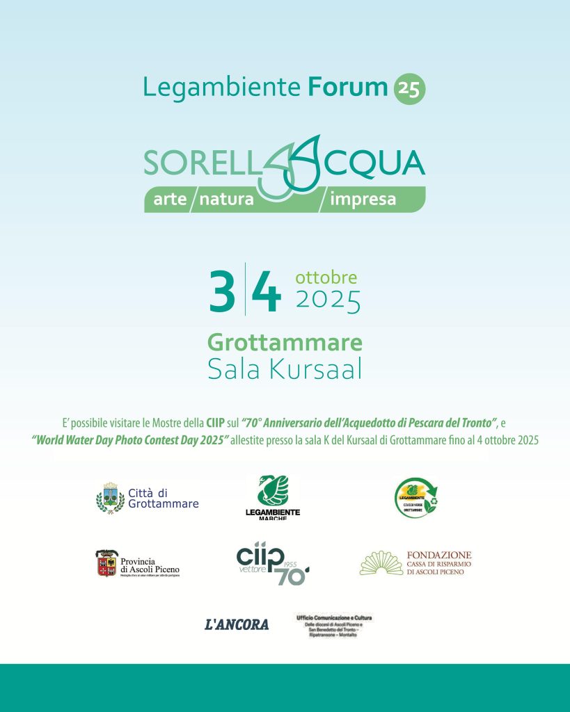 GROTTAMMARE – Un appuntamento importante si terrà nei giorni 3 e 4 ottobre a Grottammare, presso la Sala Kursaal, con il convegno “Sorella Acqua“, organizzato da Legambiente Marche e il Comune di Grottammare, con il patrocinio della Provincia di Ascoli Piceno e il contributo di CIIP e Fondazione Carisap.