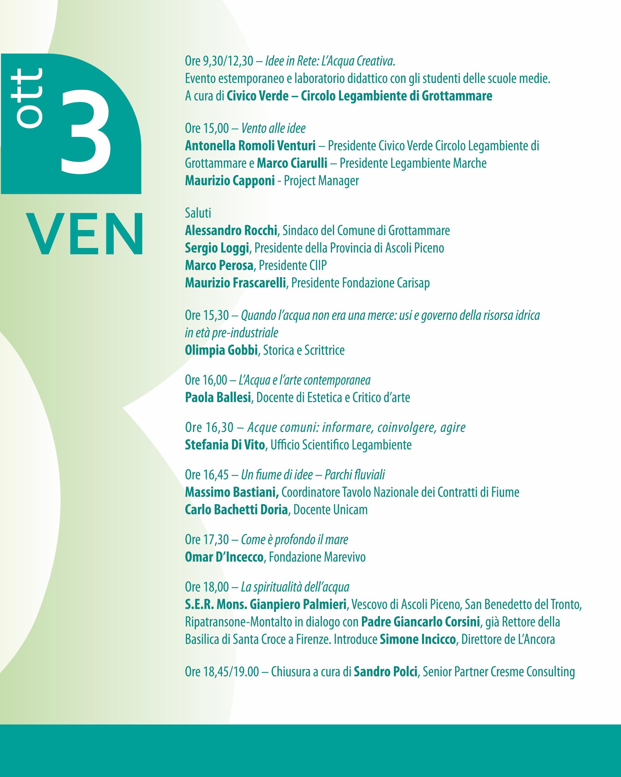 Il convegno avrà inizio il 3 ottobre, con un programma ricco di interventi. La mattina si aprirà con l’evento formativo “L’Acqua Creativa”, un laboratorio didattico, promosso da Civico Verde Circolo Legambiente di Grottammare, destinato agli studenti dell’Istituto Comprensivo “G. Leopardi”, dove si stimolerà la creatività per esplorare le tematiche dell’acqua in modo interattivo e coinvolgente. Nel pomeriggio, il focus si sposterà sulla gestione delle risorse idriche, con interventi di storici e esperti del settore, come Olimpia Gobbi, che esplorerà l’importanza dell’acqua nel passato e nel futuro delle civiltà.