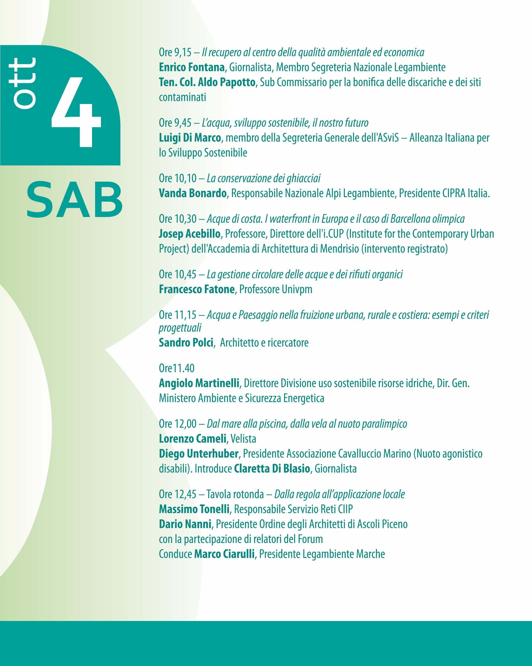 Un’attenzione particolare sarà dedicata anche alla tavola rotonda “Dalla regola all’applicazione locale”, che vedrà la partecipazione di rappresentanti locali come l’Ingegnere della CIIP Massimo Tonelli e l’Architetto Dario Nanni, Presidente dell’Ordine di Ascoli Piceno, per discutere le migliori pratiche per implementare politiche locali legate alla gestione delle risorse idriche.