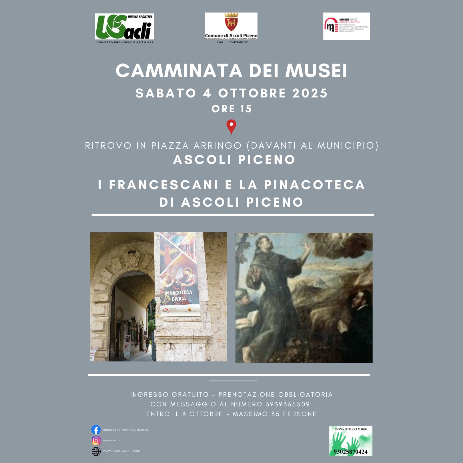 ASCOLI PICENO – Sabato 4 Ottobre è in programma ad Ascoli Piceno un nuovo evento gratuito del progetto “Camminata dei musei”, promosso da Unione Sportiva Acli provinciale APS, sostenuto dal Comune di Ascoli Piceno e realizzato in collaborazione con Ascoli Musei.