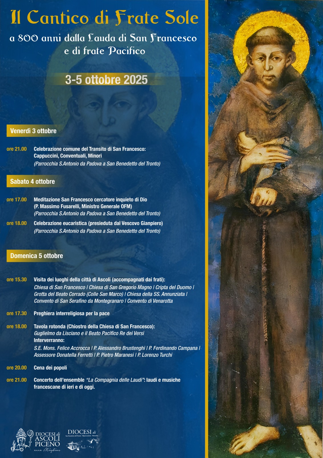 DIOCESI – Un intero fine settimana dedicato a San Francesco e alla sua eredità spirituale: dal 3 al 5 Ottobre 2025, i frati Minori, Conventuali e Cappuccini delle Diocesi di Ascoli Piceno e di San Benedetto del Tronto – Ripatransone – Montalto organizzano una serie di eventi per ricordare gli 800 anni dalla composizione del Cantico di Frate Sole e il contributo di frate Pacifico.
