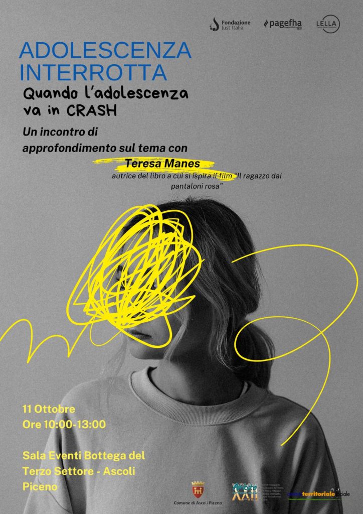 ASCOLI PICENO – Un evento significativo e necessario per accendere i riflettori su una delle fragilità più urgenti e spesso silenziose della nostra società: il disagio adolescenziale. Si terrà sabato 11 ottobre, dalle 10.00 alle 13.00 presso la Bottega del Terzo Settore di Ascoli Piceno, l’incontro Adolescenza Interrotta – Quando l’adolescenza va in crash, con la straordinaria partecipazione di Teresa Manes, autrice del libro “Andrea oltre il ragazzo dai pantaloni rosa” e madre di Andrea Spezzacatena, il giovane la cui tragica storia di bullismo e incomprensione ha commosso l’Italia. La vicenda è anche raccontata nel film Il ragazzo dai pantaloni rosa.