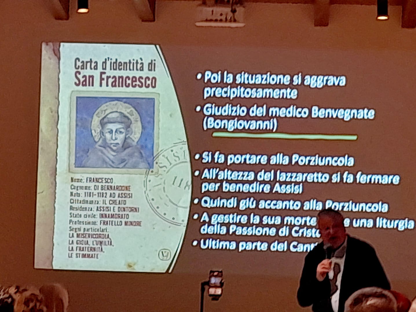 Don Francesco ha voluto mettere in evidenza come nel Cantico delle Creature confluiscano molteplici elementi della personalità di San Francesco: dalle sue origini familiari e dalla cultura del suo tempo, alla Parola di Dio, che Francesco ascoltava con somma attenzione e devozione e che riteneva a memoria per non perderne nemmeno una briciola. Infiammato dall’amore di Dio e per Dio, che lo stesso suo corpo non riesce a contenere, dopo l’esperienza delle Stimmate, in un momento di dolorosa malattia, ormai cieco, Francesco canta la bellezza della sua relazione con l’Amato e lo fa chiamando in causa tutte le creature, le quali non fanno che attestare l’amore infinito che Dio ha per lui e per tutti gli uomini e che vengono coinvolte in quella relazione che egli vive con il Padre, il Figlio e lo Spirito, e pertanto diventano esse stesse fratelli, sorelle e madri. Sì, perché è nella relazione che si vive l’amore, vuole dirci San Francesco. E dove le relazioni si interrompono o si avvelenano, trovano spazio il peccato e la morte. Ecco perché Francesco quasi alla fine della vita aggiunse al suo Cantico due strofe: una che parla del perdono e con la quale mosse alla riconciliazione il Potestà e il Vescovo di Assisi; l’altra è per accogliere la morte che egli sente ormai vicina e che può chiamare “sorella”, perché sarà lei a prenderlo per mano ed accompagnarlo nella casa del Padre, in un canto senza fine!