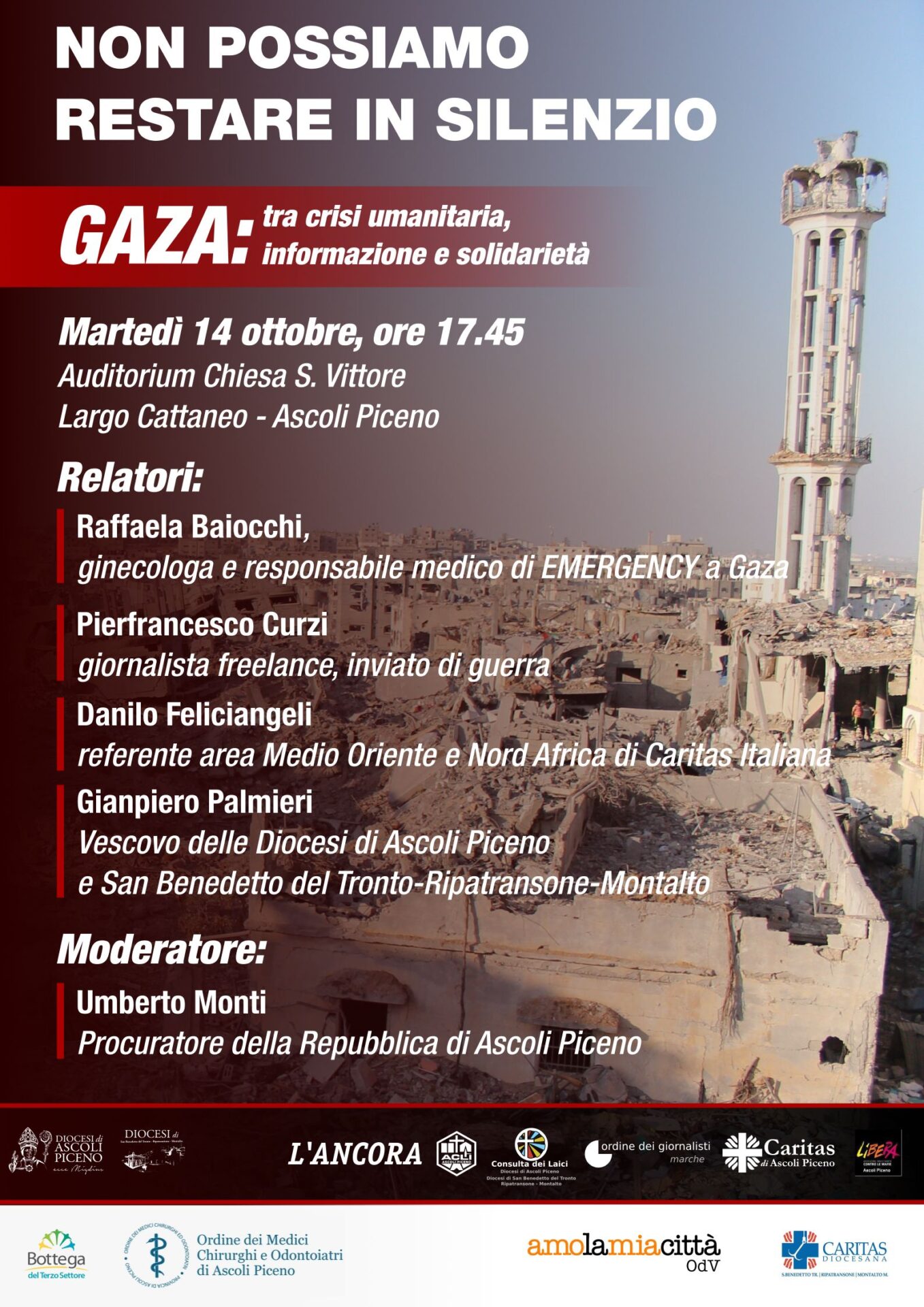 ASCOLI PICENO – Si terrà oggi, martedì 14 ottobre, alle ore 17.45 presso l’Auditorium della Chiesa di San Vittore in Largo Cattaneo, l’incontro pubblico dal titolo “Non possiamo restare in silenzio – Gaza: tra crisi umanitaria, informazione e solidarietà”.