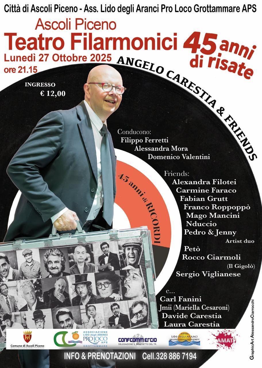 Il prossimo 27 ottobre, infatti, il Teatro Filarmonici di Ascoli Piceno ospiterà la serata già sold-out “45 anni di risate”, un evento speciale dedicato alla carriera di Angelo Carestia, storico protagonista del cabaret marchigiano e compagno di mille avventure artistiche.