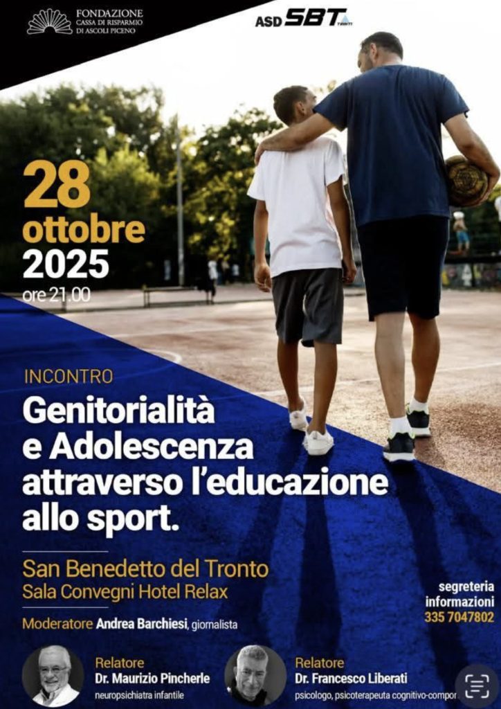 SAN BENEDETTO DEL TRONTO – Il rapporto tra genitori e figli e il ruolo dello sport come strumento educativo saranno al centro del convegno “Genitorialità e adolescenza, attraverso l’educazione allo sport”, in programma martedì 28 ottobre alle ore 21.00 presso la Sala Conferenze dell’Hotel Relax di San Benedetto del Tronto.
