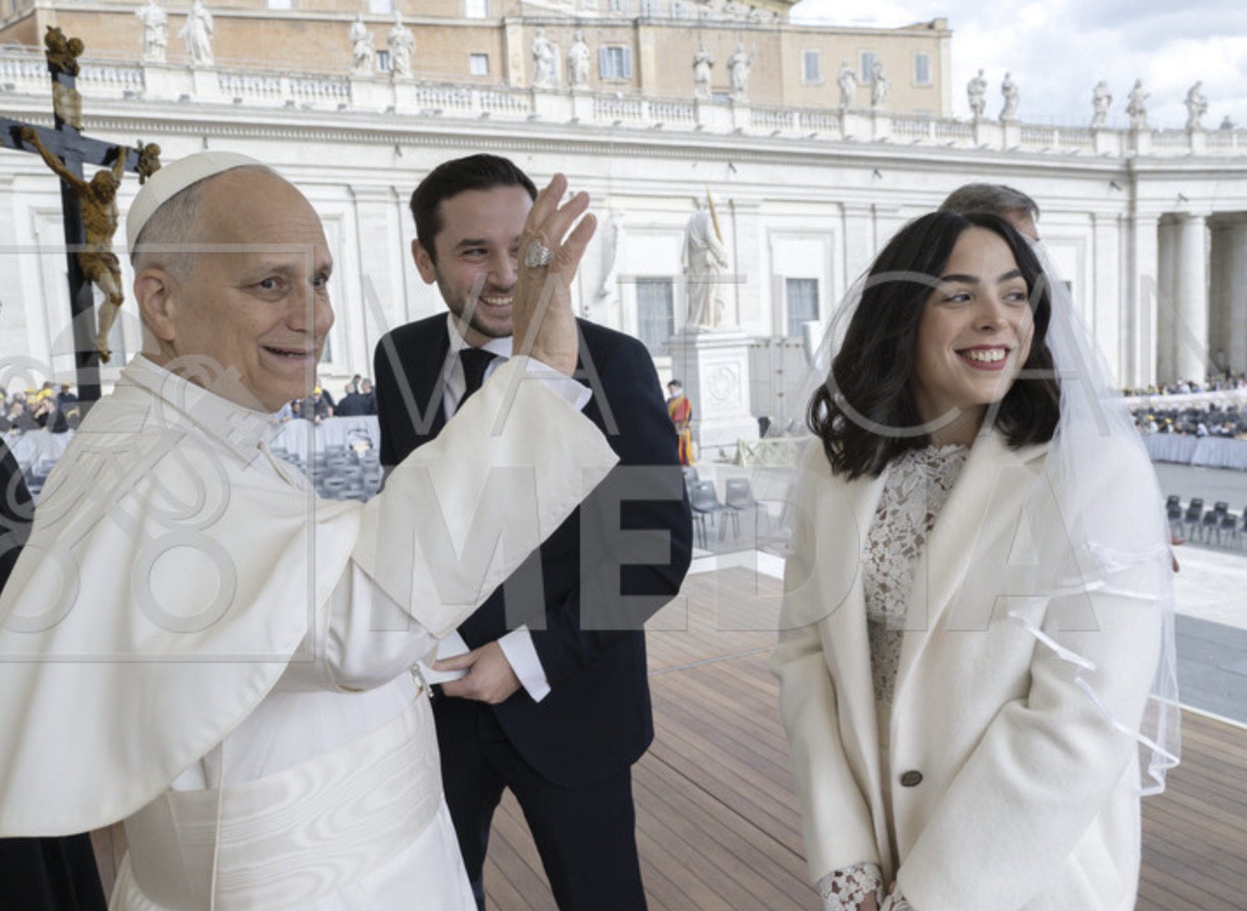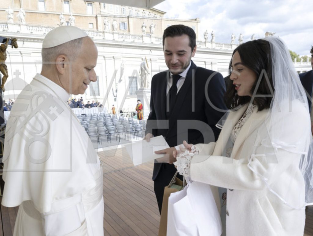 I due giovani sposi hanno avuto anche la gioia di incontrare Papa Leone, con il quale hanno scambiato alcune parole e a cui hanno donato due tipicità della loro terra: l’anisetta e le olive all’ascolana.
