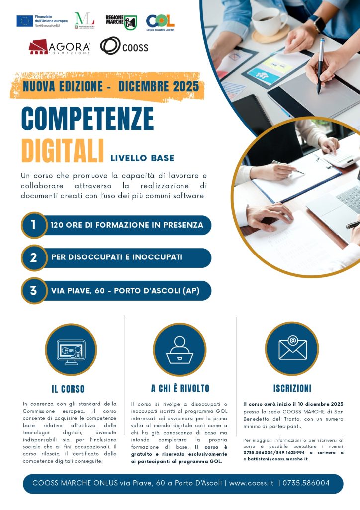 SAN BENEDETTO DEL TRONTO – Un’importante opportunità formativa arriva a San Benedetto del Tronto grazie alla COOSS Cooperativa Sociale, che promuove un corso gratuito di competenze digitali di base rivolto a persone disoccupate.