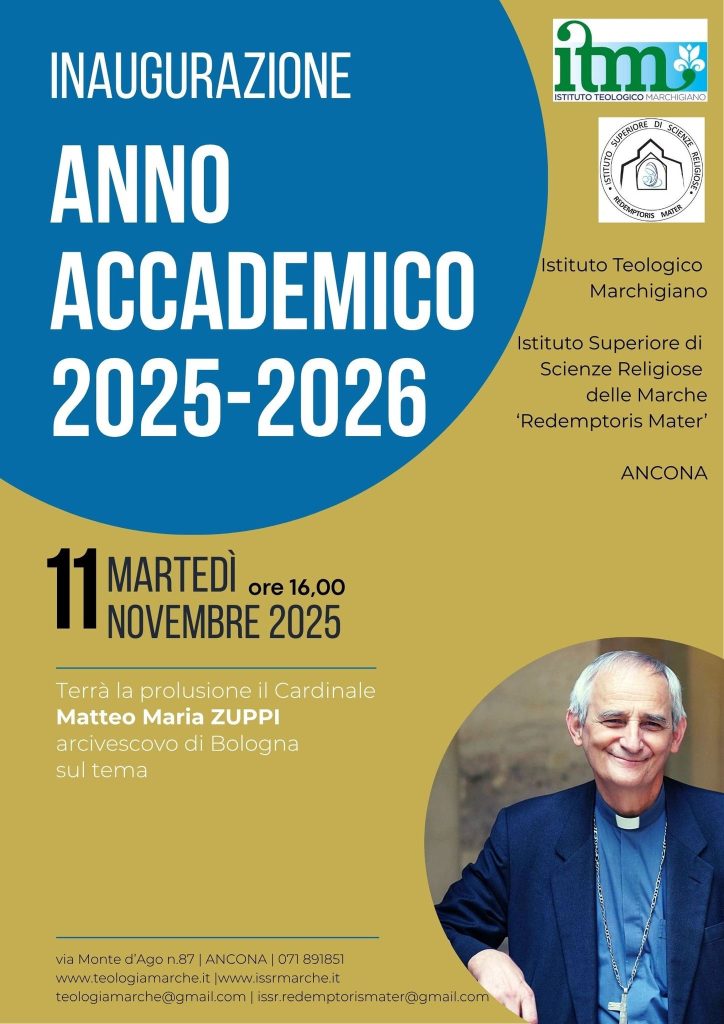 MARCHE – L’Istituto Teologico Marchigiano e l’Istituto Superiore di Scienze Religiose delle Marche “Redemptoris Mater” annunciano con gioia l’inaugurazione dell’Anno Accademico 2025-2026, che si terrà martedì 11 novembre 2025 alle ore 16.00 presso la sede di Ancona, in via Monte d’Ago n. 87.