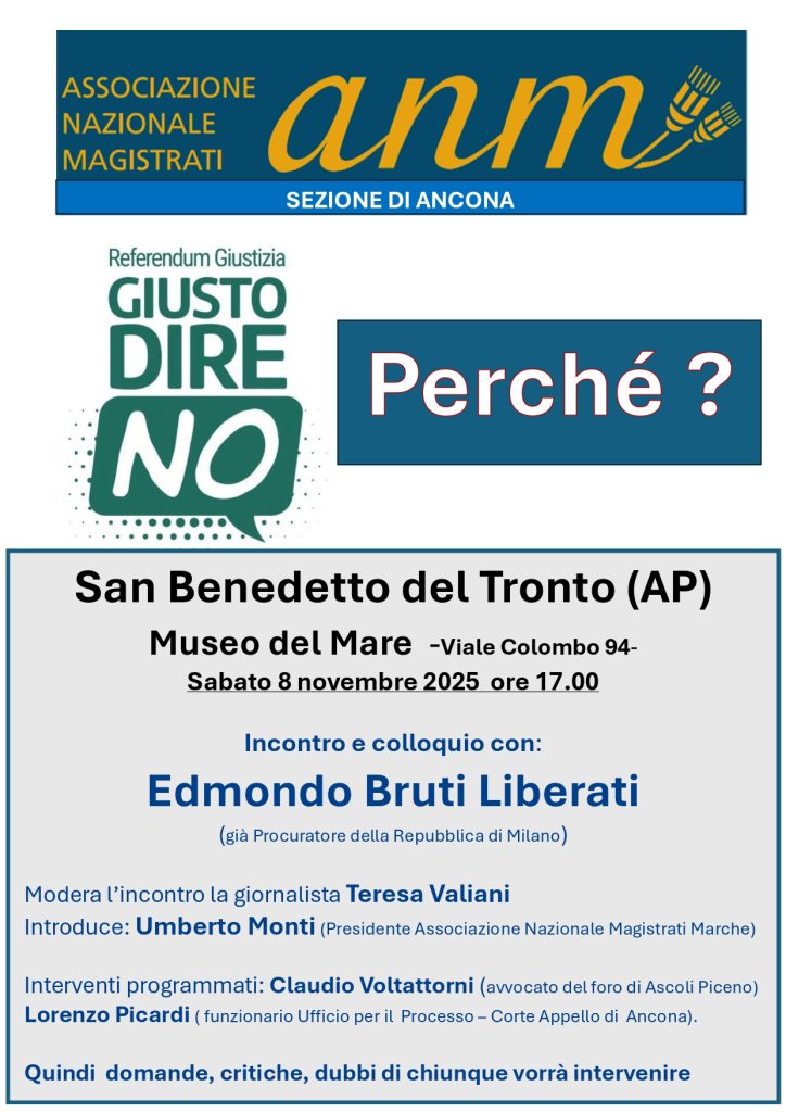 SAN BENEDETTO DEL TRONTO – Un appuntamento di approfondimento e confronto sul tema della giustizia e sulle ragioni del “No” al referendum sarà ospitato sabato 8 novembre 2025, alle ore 17.00, presso il Museo del Mare di San Benedetto del Tronto (Viale Colombo 94).