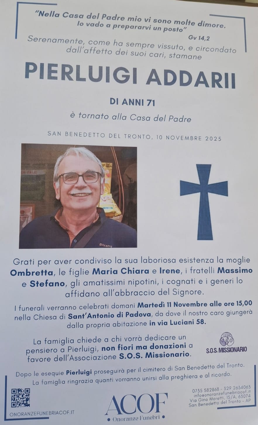 La Messa per il funerale di Pierluigi Addarii verrà celebrata domani, 11 Novembre, alle ore 15:00, presso la chiesa Sant’Antonio di Padova in San Benedetto del Tronto, nella comunità parrocchiale a cui apparteneva. Appena verrà stabilito l’orario preciso della Celebrazione, l’articolo verrà aggiornato.