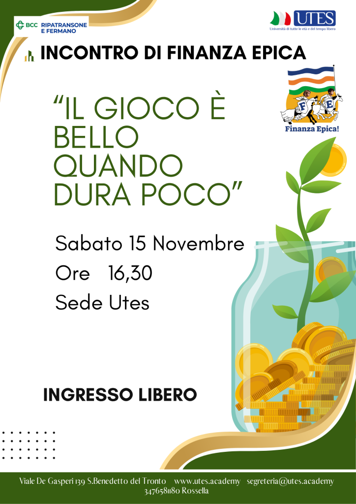 SAN BENEDETTO DEL TRONTO – L’UTES, in collaborazione con la BCC di Ripatransone e del Fermano, organizza un importante incontro di informazione e sensibilizzazione dal titolo “Il Gioco è Bello Quando Dura Poco”, che si terrà venerdì 15 novembre 2025 alle ore 16.30 presso la sede UTES.