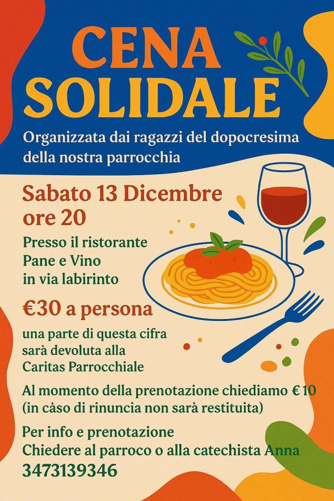 L’appuntamento è per Sabato 13 Dicembre 2025, alle ore 20:00, presso il ristorante “Pane e Vino” in via Labirinto. Il costo della cena è di 30 euro a persona, di cui 10 andranno anticipati al momento della prenotazione.
