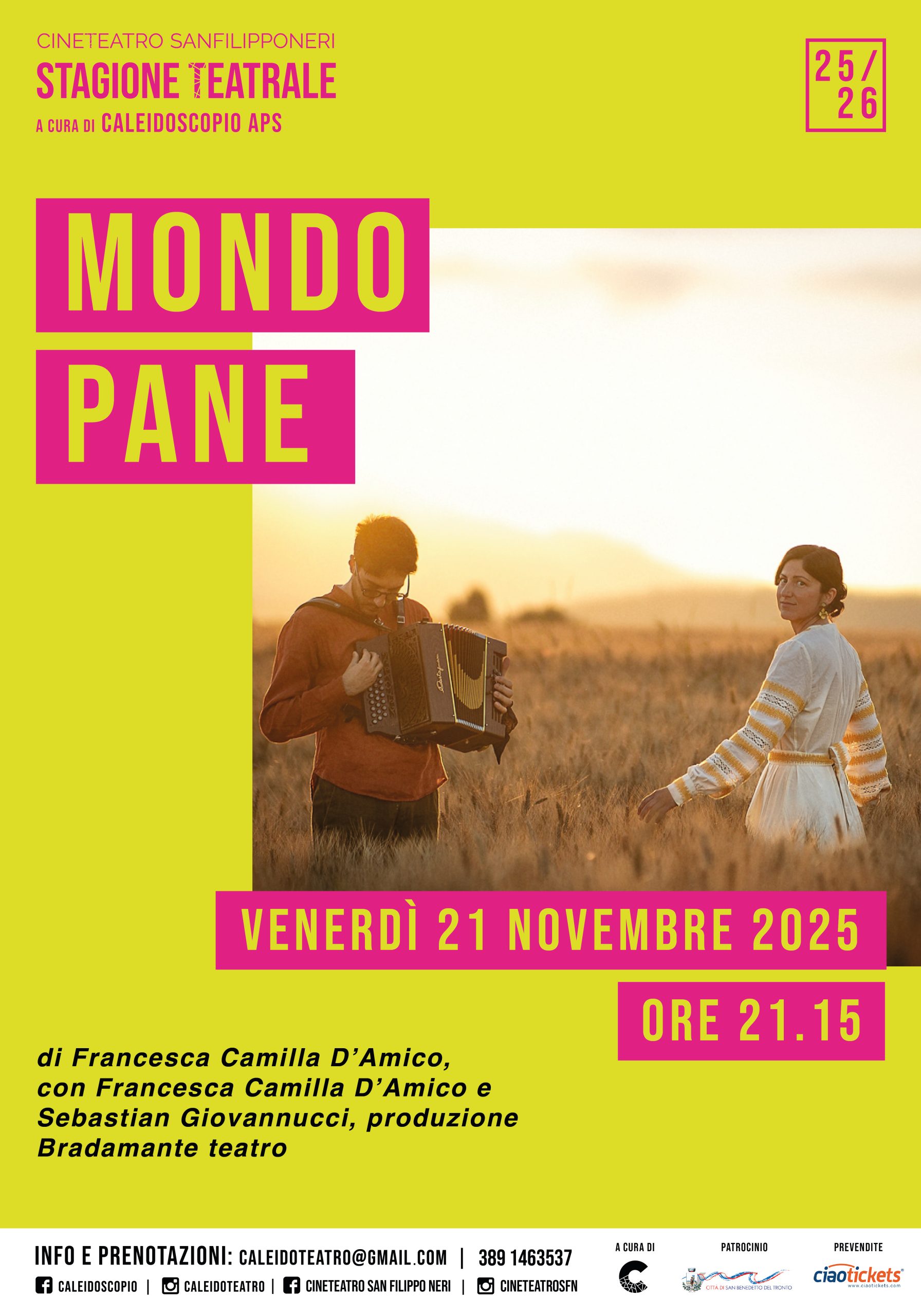 Il primo spettacolo di questa stagione è: “Mondo Pane” venerdì 21 novembre 2025 ore 21.15,di Francesca Camilla D’Amico, con Francesca Camilla D’Amico e Sebastian Giovannucci, produzione Bradamante teatro
