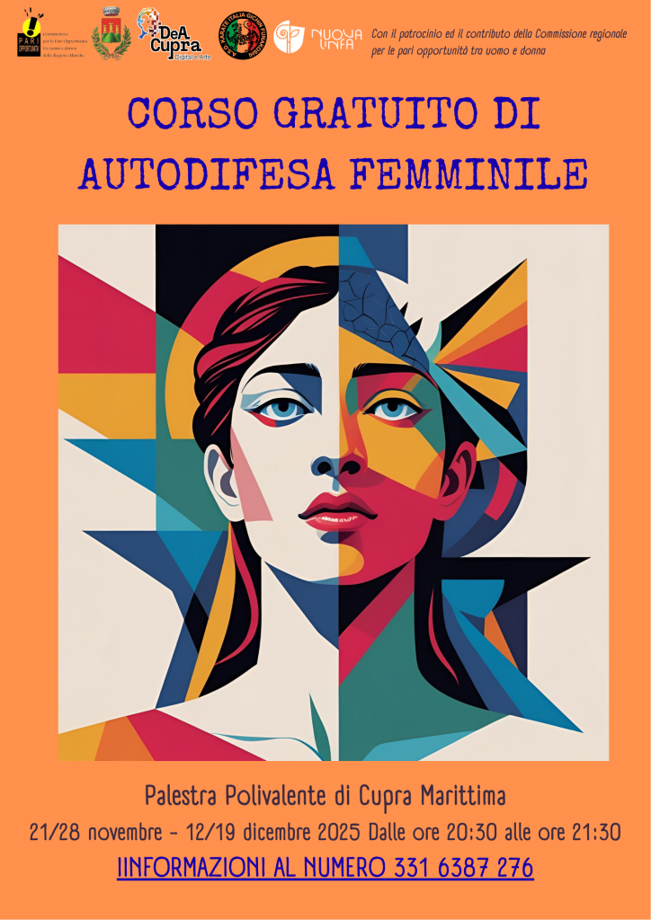 Contestualmente, allo spettacolo teatrale si lega anche un’altra importante iniziativa organizzata dall’A.S.D. Karate Italia Gichin Funakoshi ovvero un corso gratuito di autodifesa femminile tenuto dal Maestro Domenico Bonatesta e dal Maestro Salvatore Lezzi rivolto a tutte le donne a partire dai 14 anni di età della durata di quattro lezioni che si terranno presso la Palestra Polivalente di Cupra Marittima, dalle ore 20:30 alle ore 21:30 a partire da venerdì 21 novembre per proseguire poi il 28 novembre, il 12 e il 19 dicembre.