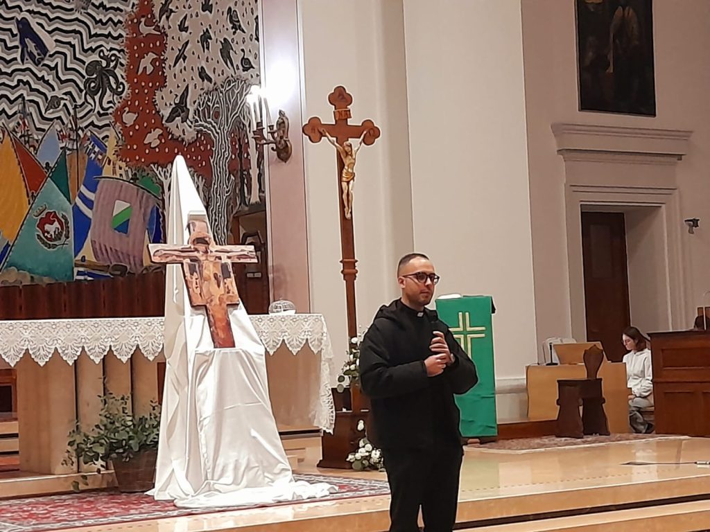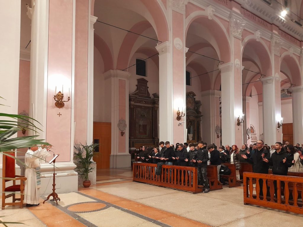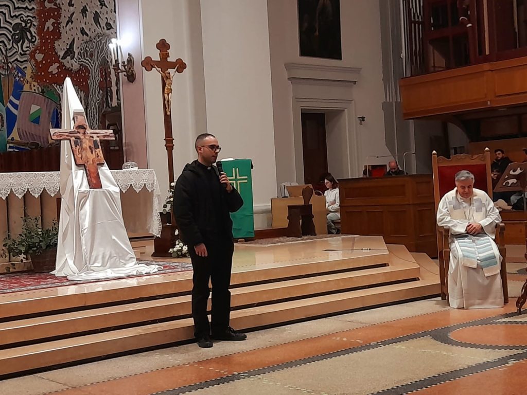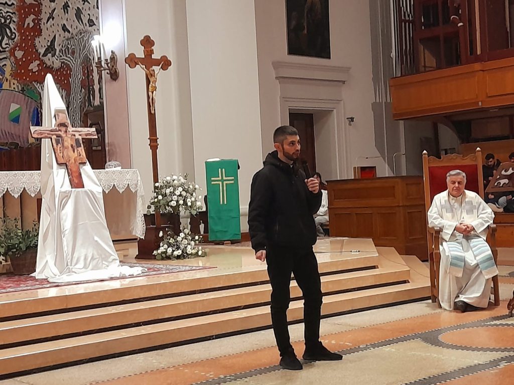 A concludere la serata è stato il vescovo Gianpiero Palmieri, il quale ha affermato: “L’amicizia è un fatto di sguardi. Domenica ci sarà il racconto di uno sguardo particolare che Gesù dà ad una persona, forse l’ultimo sguardo d’amore al mondo. È lo sguardo che Gesù rivolge a Disma, quello che comunemente viene chiamato il buon ladrone. Ma Disma non era buono per niente! Per stare su quella croce chissà quante ne aveva fatte! Ne aveva fatte sicuramente tante quante l’altro ladrone. Disma è dunque uno che nella vita ha peccato. Peccare significa letteralmente ‘sbagliare il bersaglio’. Quando pensiamo al peccato, dobbiamo immaginare un arco e una freccia che non centra il bersaglio. Peccare, infatti, significa sbagliare bersaglio nella vita. Vorrei essere felice e mi ritrovo triste. Vorrei avere dei buoni amici e mi ritrovo solo. Vorrei andare bene a scuola e invece non riesco. Insomma anche Disma aveva peccato, aveva commesso degli errori di bersaglio, come capita a tutti. Ma quando sale sulla croce, capisce una cosa importante, cioè che quello che era stato condannato, era il Re. Allora Disma dice al Signore una cosa molto umana: «Gesù, ricordati di me quando entrerai nel tuo regno». Ed è questo lo sguardo di amicizia a cui Gesù rivolge, a sua volta, il suo sguardo d’amicizia, dicendogli: « In verità ti dico, oggi sarai con me nel Paradiso». Il primo ad andare in Paradiso, dunque, dietro a Gesù, non è la Madonna, che è la creatura perfetta, ma Disma, il ladrone. Questo significa che, quando uno si guarda allo specchio e si riconosce peccatore ma al tempo stesso volge lo sguardo al Signore, ecco che il suo cuore si infiamma“.