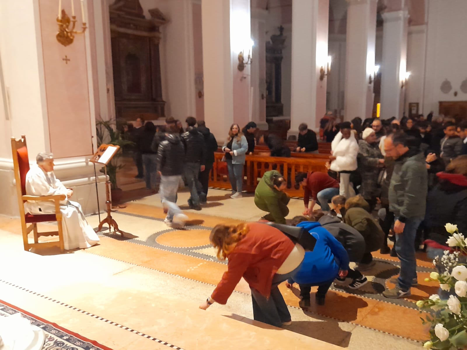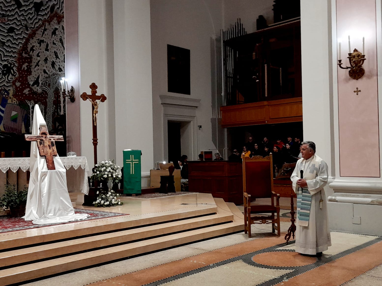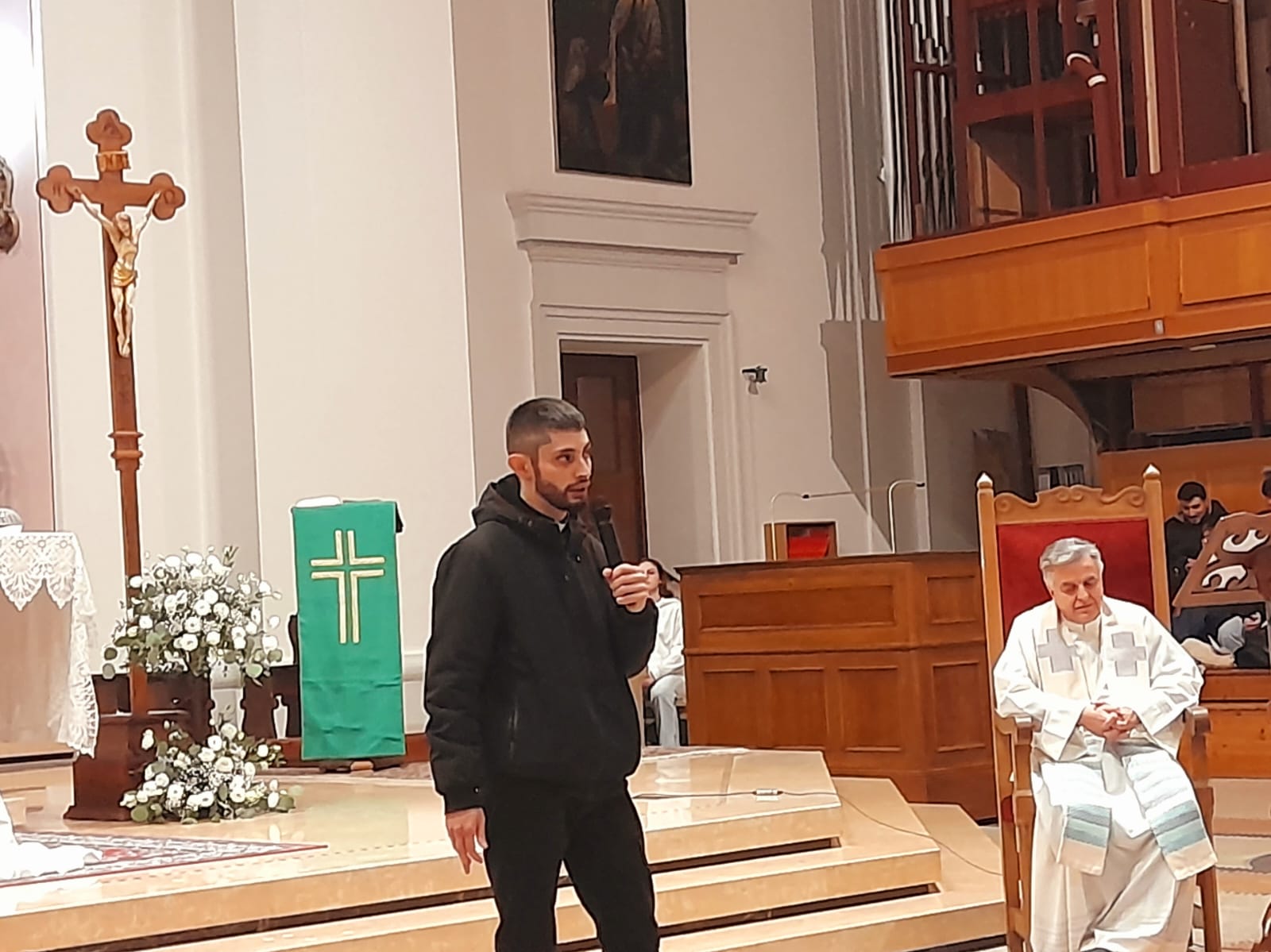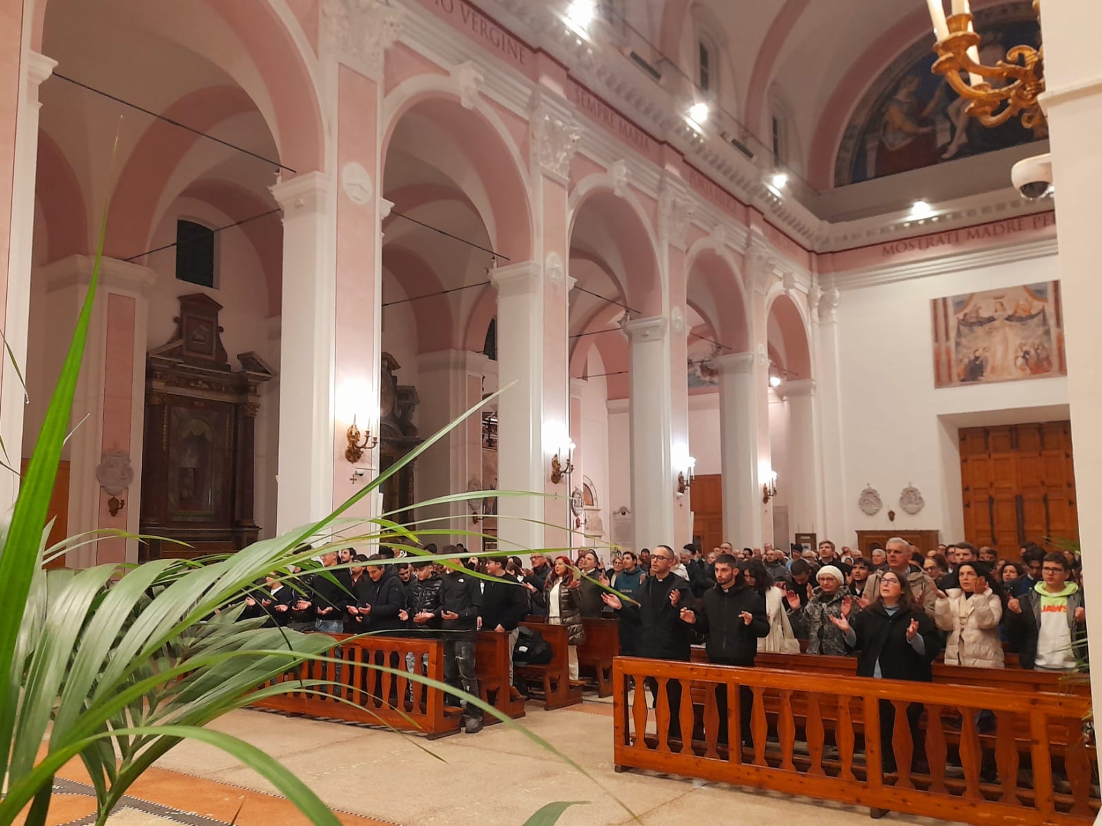 A concludere la serata è stato il vescovo Gianpiero Palmieri, il quale ha affermato: “L’amicizia è un fatto di sguardi. Domenica ci sarà il racconto di uno sguardo particolare che Gesù dà ad una persona, forse l’ultimo sguardo d’amore al mondo. È lo sguardo che Gesù rivolge a Disma, quello che comunemente viene chiamato il buon ladrone. Ma Disma non era buono per niente! Per stare su quella croce chissà quante ne aveva fatte! Ne aveva fatte sicuramente tante quante l’altro ladrone. Disma è dunque uno che nella vita ha peccato. Peccare significa letteralmente ‘sbagliare il bersaglio’. Quando pensiamo al peccato, dobbiamo immaginare un arco e una freccia che non centra il bersaglio. Peccare, infatti, significa sbagliare bersaglio nella vita. Vorrei essere felice e mi ritrovo triste. Vorrei avere dei buoni amici e mi ritrovo solo. Vorrei andare bene a scuola e invece non riesco. Insomma anche Disma aveva peccato, aveva commesso degli errori di bersaglio, come capita a tutti. Ma quando sale sulla croce, capisce una cosa importante, cioè che quello che era stato condannato, era il Re. Allora Disma dice al Signore una cosa molto umana: «Gesù, ricordati di me quando entrerai nel tuo regno». Ed è questo lo sguardo di amicizia a cui Gesù rivolge, a sua volta, il suo sguardo d’amicizia, dicendogli: « In verità ti dico, oggi sarai con me nel Paradiso». Il primo ad andare in Paradiso, dunque, dietro a Gesù, non è la Madonna, che è la creatura perfetta, ma Disma, il ladrone. Questo significa che, quando uno si guarda allo specchio e si riconosce peccatore ma al tempo stesso volge lo sguardo al Signore, ecco che il suo cuore si infiamma“.