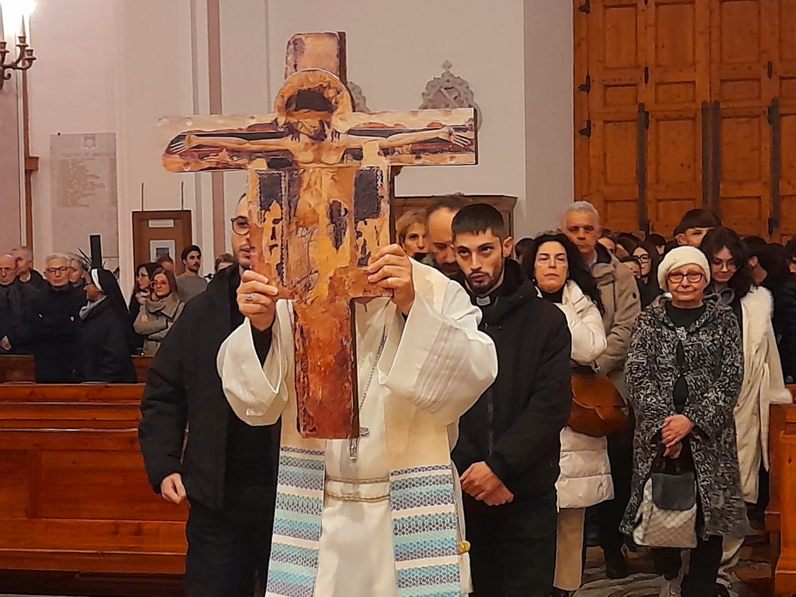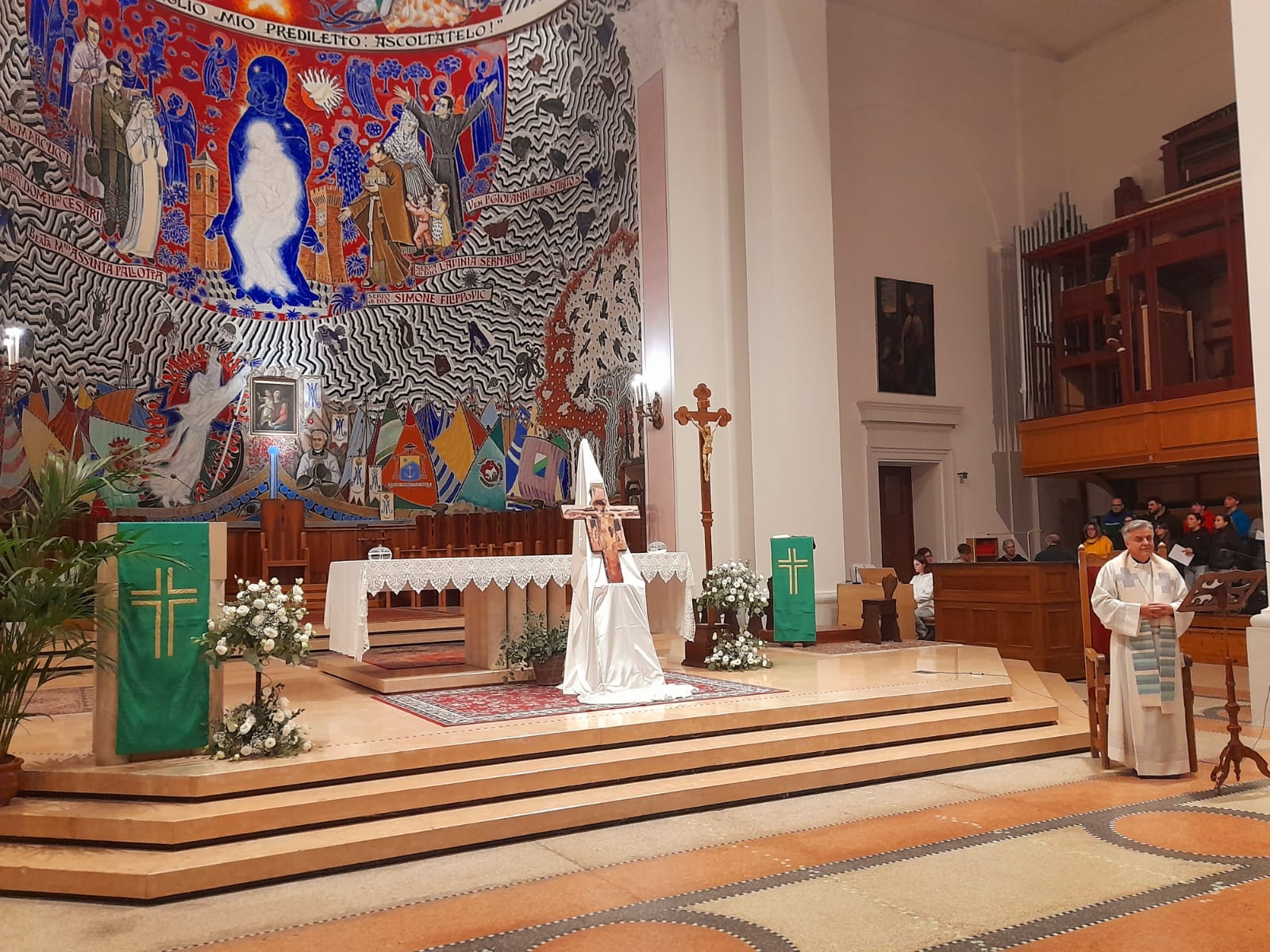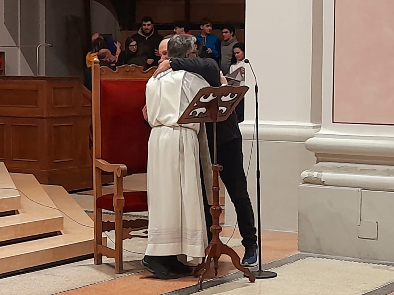 A concludere la serata è stato il vescovo Gianpiero Palmieri, il quale ha affermato: “L’amicizia è un fatto di sguardi. Domenica ci sarà il racconto di uno sguardo particolare che Gesù dà ad una persona, forse l’ultimo sguardo d’amore al mondo. È lo sguardo che Gesù rivolge a Disma, quello che comunemente viene chiamato il buon ladrone. Ma Disma non era buono per niente! Per stare su quella croce chissà quante ne aveva fatte! Ne aveva fatte sicuramente tante quante l’altro ladrone. Disma è dunque uno che nella vita ha peccato. Peccare significa letteralmente ‘sbagliare il bersaglio’. Quando pensiamo al peccato, dobbiamo immaginare un arco e una freccia che non centra il bersaglio. Peccare, infatti, significa sbagliare bersaglio nella vita. Vorrei essere felice e mi ritrovo triste. Vorrei avere dei buoni amici e mi ritrovo solo. Vorrei andare bene a scuola e invece non riesco. Insomma anche Disma aveva peccato, aveva commesso degli errori di bersaglio, come capita a tutti. Ma quando sale sulla croce, capisce una cosa importante, cioè che quello che era stato condannato, era il Re. Allora Disma dice al Signore una cosa molto umana: «Gesù, ricordati di me quando entrerai nel tuo regno». Ed è questo lo sguardo di amicizia a cui Gesù rivolge, a sua volta, il suo sguardo d’amicizia, dicendogli: « In verità ti dico, oggi sarai con me nel Paradiso». Il primo ad andare in Paradiso, dunque, dietro a Gesù, non è la Madonna, che è la creatura perfetta, ma Disma, il ladrone. Questo significa che, quando uno si guarda allo specchio e si riconosce peccatore ma al tempo stesso volge lo sguardo al Signore, ecco che il suo cuore si infiamma“.