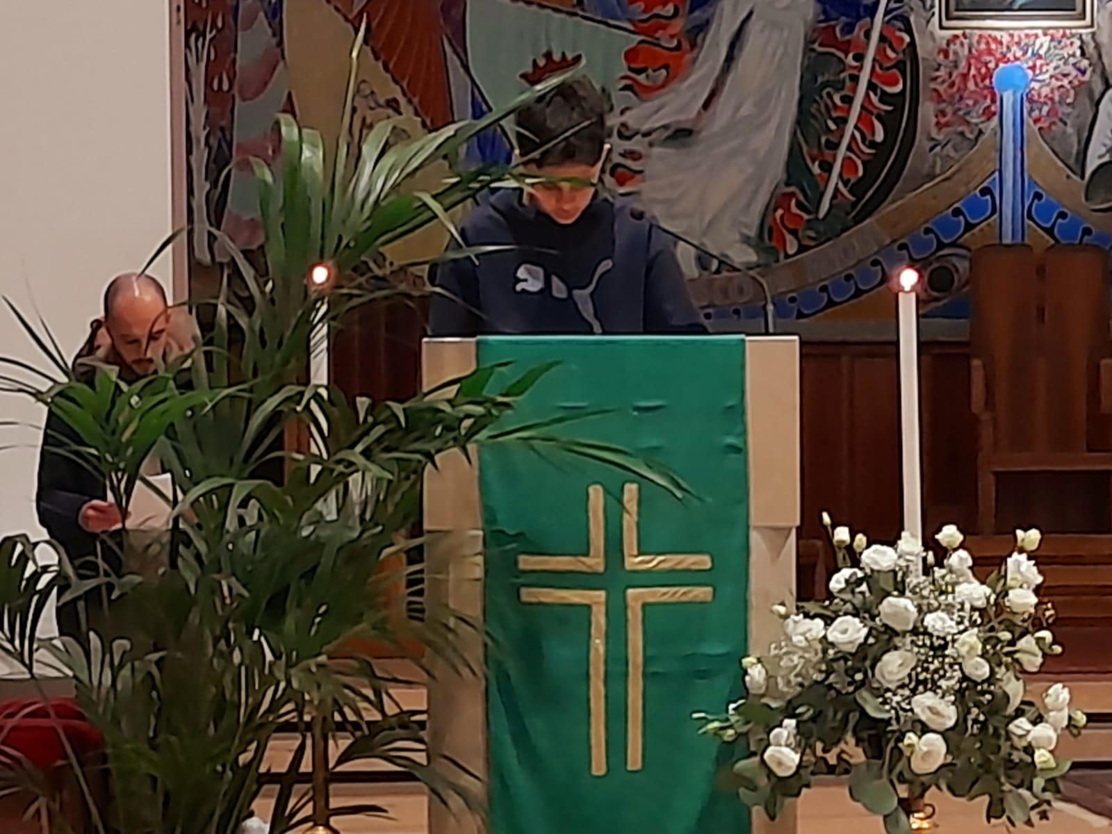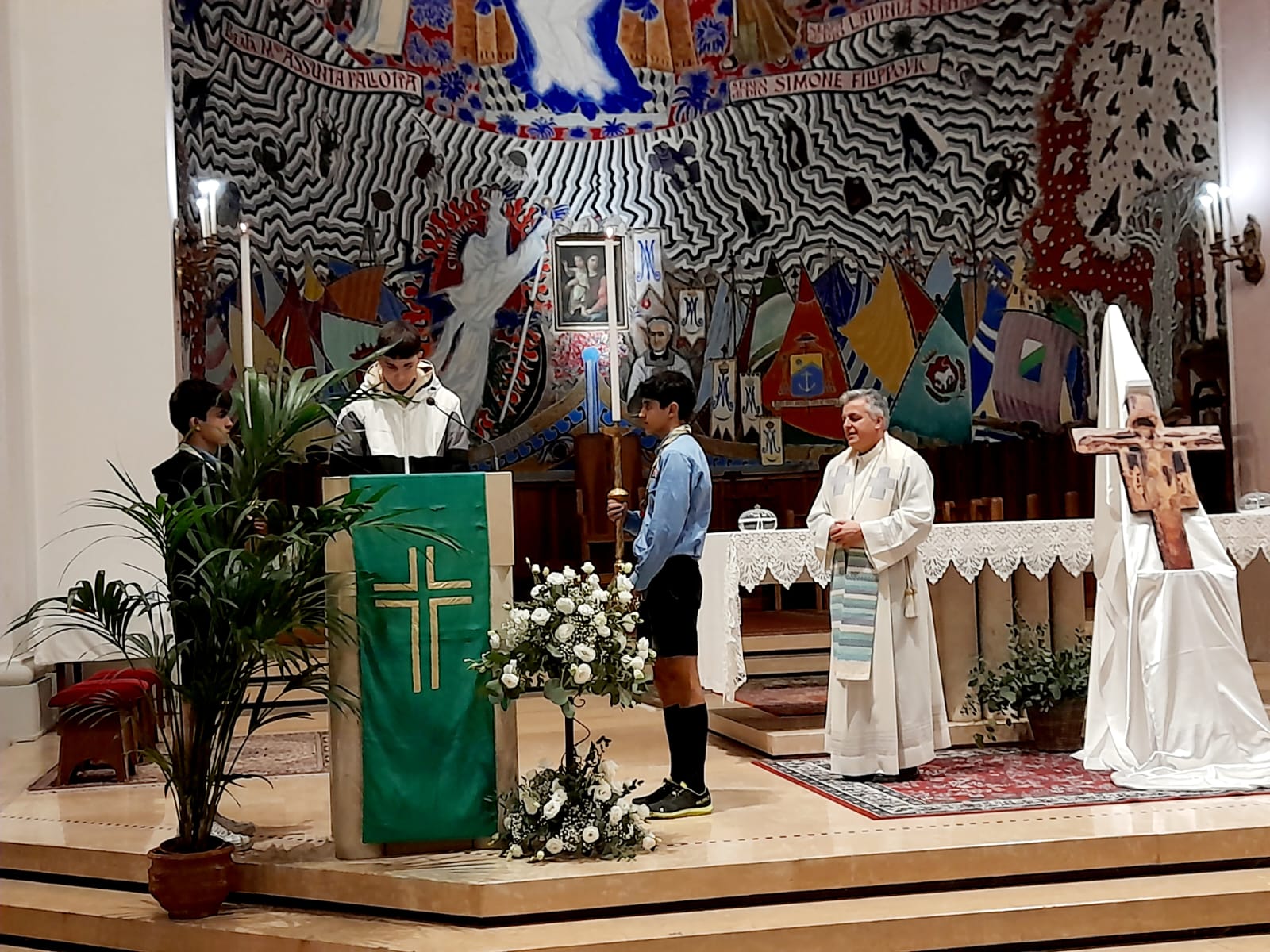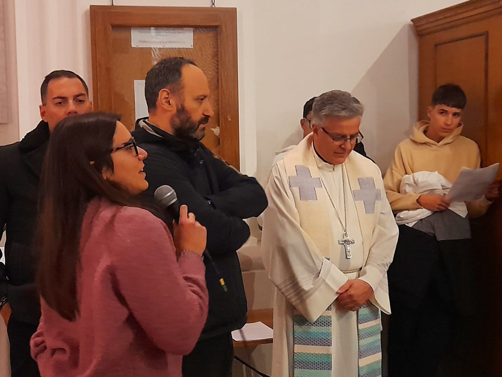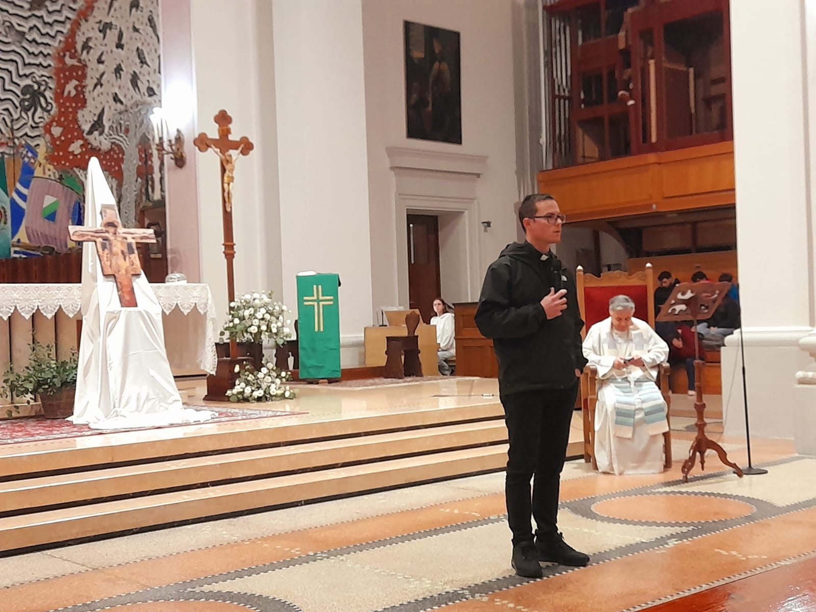 A concludere la serata è stato il vescovo Gianpiero Palmieri, il quale ha affermato: “L’amicizia è un fatto di sguardi. Domenica ci sarà il racconto di uno sguardo particolare che Gesù dà ad una persona, forse l’ultimo sguardo d’amore al mondo. È lo sguardo che Gesù rivolge a Disma, quello che comunemente viene chiamato il buon ladrone. Ma Disma non era buono per niente! Per stare su quella croce chissà quante ne aveva fatte! Ne aveva fatte sicuramente tante quante l’altro ladrone. Disma è dunque uno che nella vita ha peccato. Peccare significa letteralmente ‘sbagliare il bersaglio’. Quando pensiamo al peccato, dobbiamo immaginare un arco e una freccia che non centra il bersaglio. Peccare, infatti, significa sbagliare bersaglio nella vita. Vorrei essere felice e mi ritrovo triste. Vorrei avere dei buoni amici e mi ritrovo solo. Vorrei andare bene a scuola e invece non riesco. Insomma anche Disma aveva peccato, aveva commesso degli errori di bersaglio, come capita a tutti. Ma quando sale sulla croce, capisce una cosa importante, cioè che quello che era stato condannato, era il Re. Allora Disma dice al Signore una cosa molto umana: «Gesù, ricordati di me quando entrerai nel tuo regno». Ed è questo lo sguardo di amicizia a cui Gesù rivolge, a sua volta, il suo sguardo d’amicizia, dicendogli: « In verità ti dico, oggi sarai con me nel Paradiso». Il primo ad andare in Paradiso, dunque, dietro a Gesù, non è la Madonna, che è la creatura perfetta, ma Disma, il ladrone. Questo significa che, quando uno si guarda allo specchio e si riconosce peccatore ma al tempo stesso volge lo sguardo al Signore, ecco che il suo cuore si infiamma“.