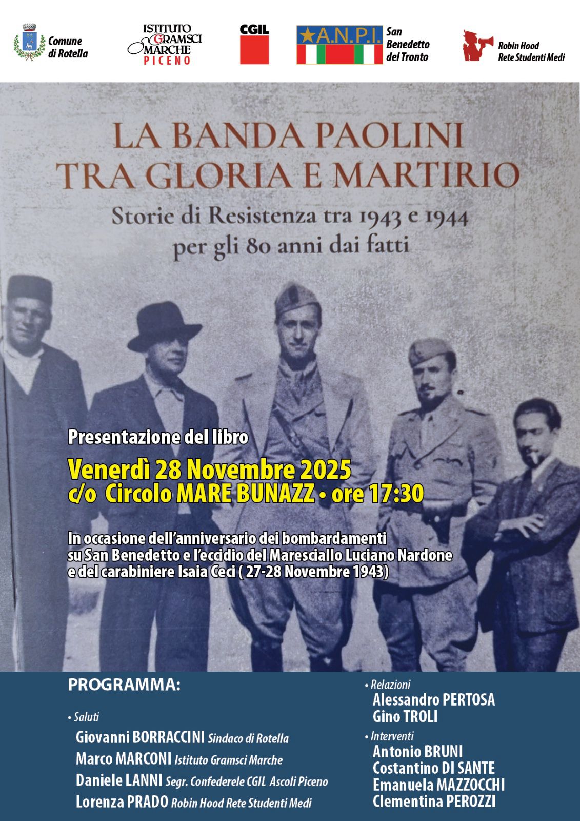 SAN BENEDETTO DEL TRONTO – Venerdì 28 novembre, alle ore 17.30, nella sede del Circolo Mare Bunazz, si terrà la presentazione del volume La banda Paolini tra gloria e martirio, scritto da Alessandro Pertosa e Gino Troli. L’incontro sarà l’occasione per ricordare i giorni dei bombardamenti su San Benedetto del Tronto e l’eccidio del maresciallo Luciano Nardone e del carabiniere Isaia Ceci, uccisi dai nazisti il 27 e 28 novembre 1943.