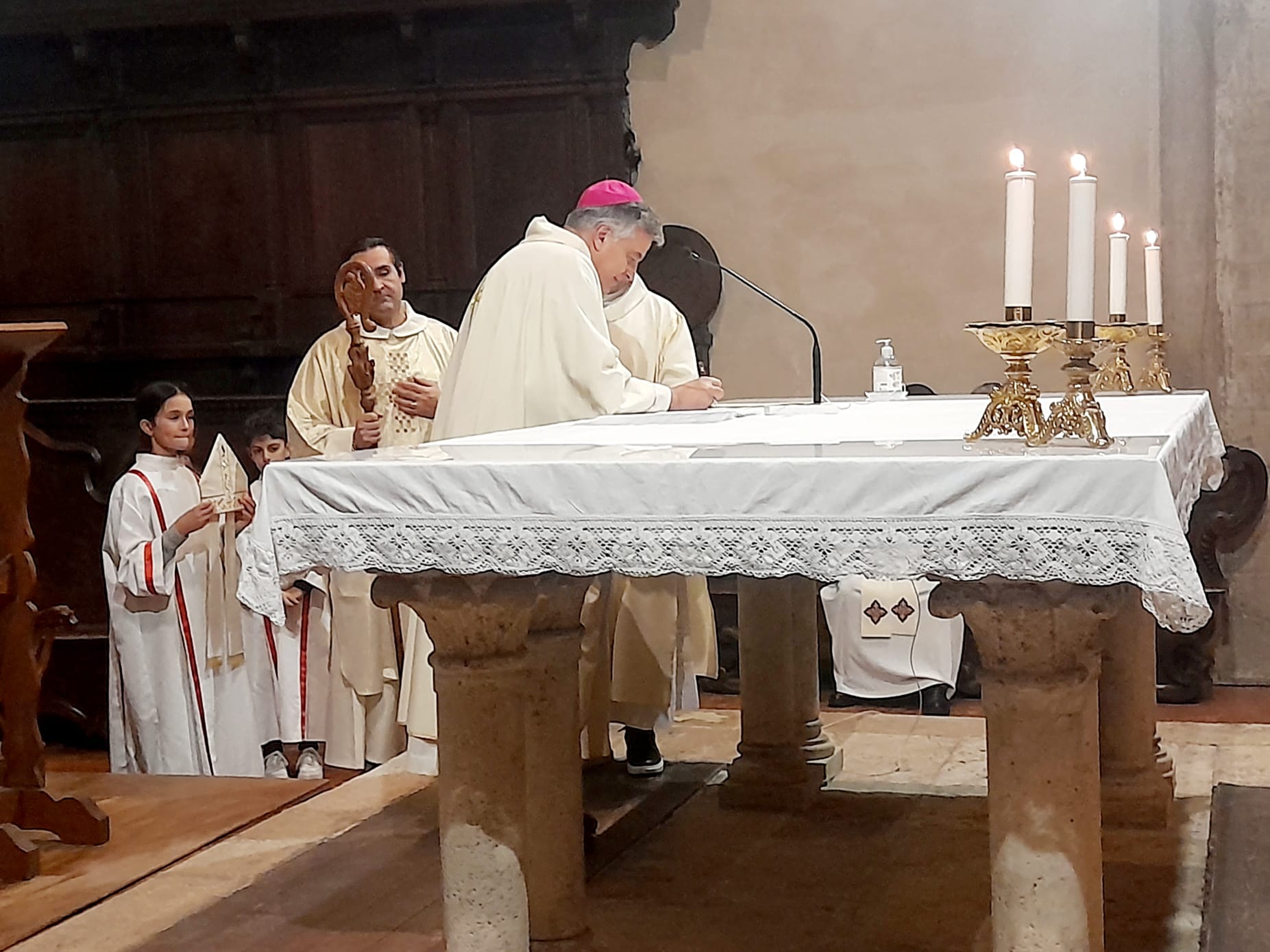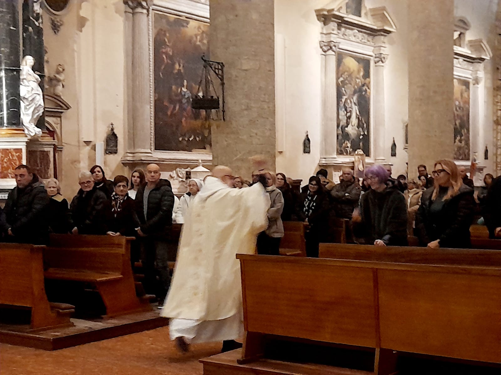 La Celebrazione Eucaristica si è aperta con la lettura della Bolla di Nomina, dopo la quale il nuovo parroco ha compiuto due gesti liturgici molto significativi che esprimono il suo mistero in mezzo alla comunità ecclesiale. Prima l’aspersione dell’altare e di tutti i fedeli con l’acqua benedetta del Fonte Battesimale, in quanto il suo compito sarà riattualizzare continuamente nei parrocchiani il dono grande che hanno ricevuto il giorno in cui sono stati battezzati. Poi la venerazione dell’altare con il bacio e l’incensazione dell’altare e dell’assemblea e della statua di Santa Maria della Pace, a cui la chiesa di Ancarano è intitolata, in quanto la missione del nuovo parroco sarà quella di ricordare che l’unico fondamento della comunità cristiana è Gesù, di cui nella Liturgia l’altare è il simbolo, pietra angolare della Chiesa, edificio spirituale di pietre vive, che siamo noi.