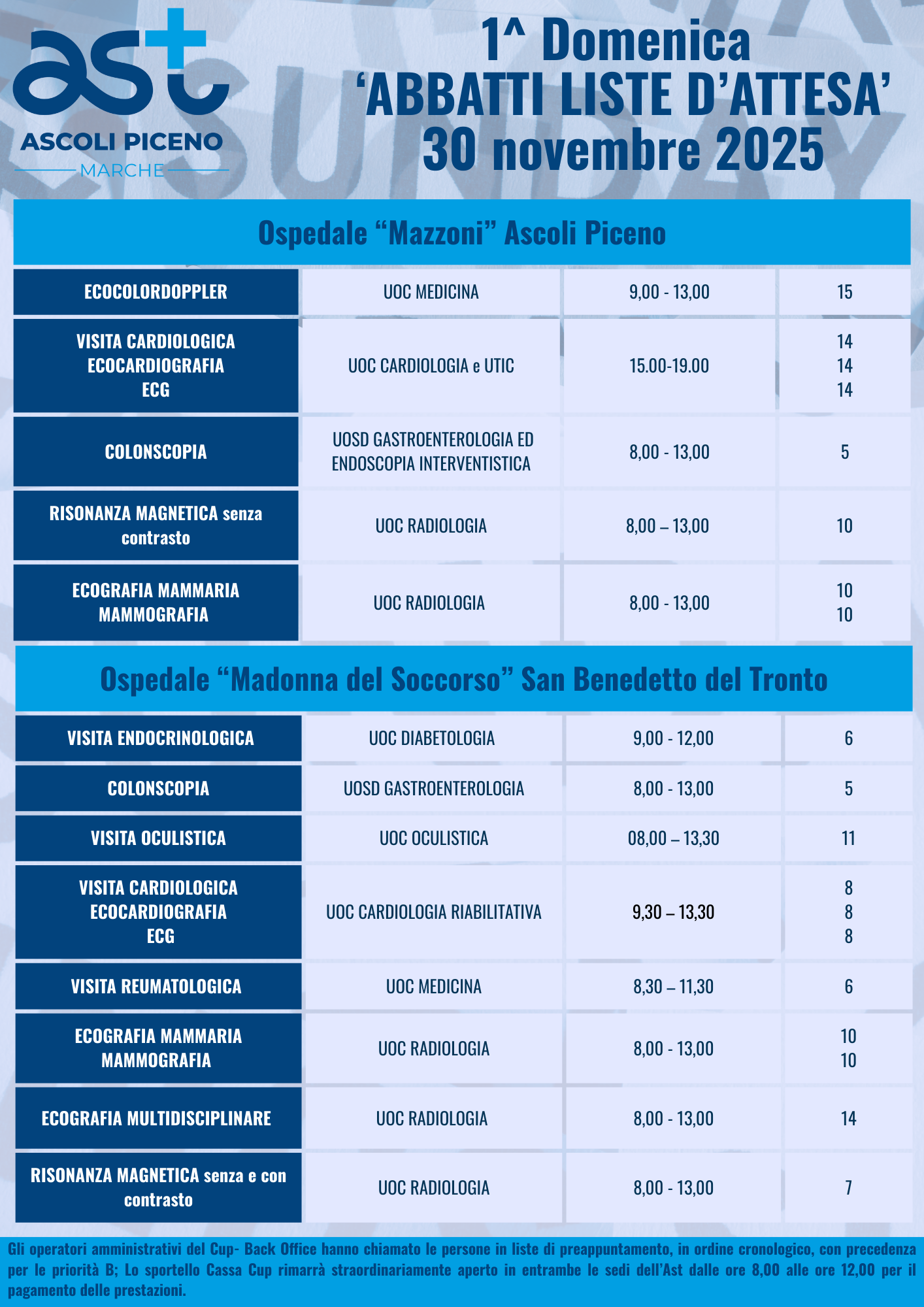 “L’apertura straordinaria degli ambulatori nella giornata di domenica – evidenzia il direttore generale dell’Ast di Ascoli, Antonello Maraldo – rappresenta un passo concreto per ridurre le liste d’attesa, soprattutto delle prestazioni specialistiche le cui agende sono più piene. Abbiamo voluto cogliere subito l’invito dell’assessore regionale alla sanità Calcinaro di programmare giornate come queste nei giorni festivi. Del resto la stessa normativa sul governo delle liste d’attesa estende le fasce orarie e le giornate di erogazione delle prestazioni anche al fine settimana. L’apertura straordinaria di domenica prossima degli ambulatori ha comportato uno sforzo organizzativo importante, reso possibile grazie alla collaborazione dei nostri professionisti, che hanno accolto con senso di responsabilità questa iniziativa. Li ringrazio in quanto non era scontato. Ringrazio anche la direzione amministrativa ospedaliera e la direzione medica di presidio, così come il personale amministrativo per la disponibilità data, da parte di tutti, per questa giornata”.