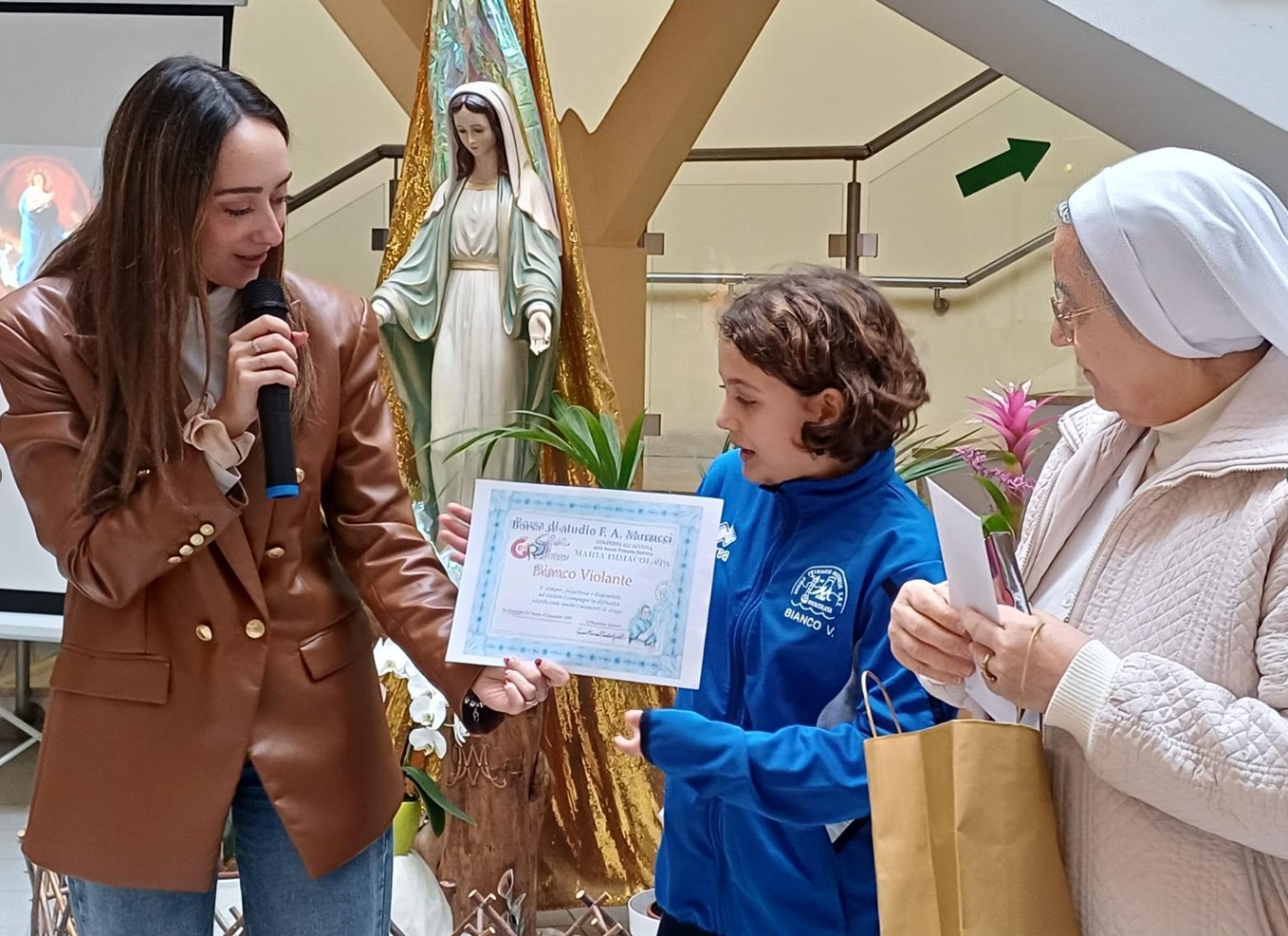 Nel pomeriggio, il teatrino della Scuola ha ospitato la cerimonia di premiazione degli alunni che si sono distinti per gesti di generosità, solidarietà e rispetto, valori ispirati all’esempio del Venerabile Marcucci. La Preside, suor M. Antonia Casotto, ha guidato l’incontro, accogliendo e ringraziando i presenti prima di dare la parola alle autorità intervenute: la Superiora generale, suor M. Paola Giobbi, promotrice della borsa di studio giunta alla tredicesima edizione; gli assessori Gianni Silvestri e Donatella Ferretti; e il presidente del BIM Tronto, dott. Luigi Contisciani, che da anni sostiene economicamente gli studenti meritevoli.