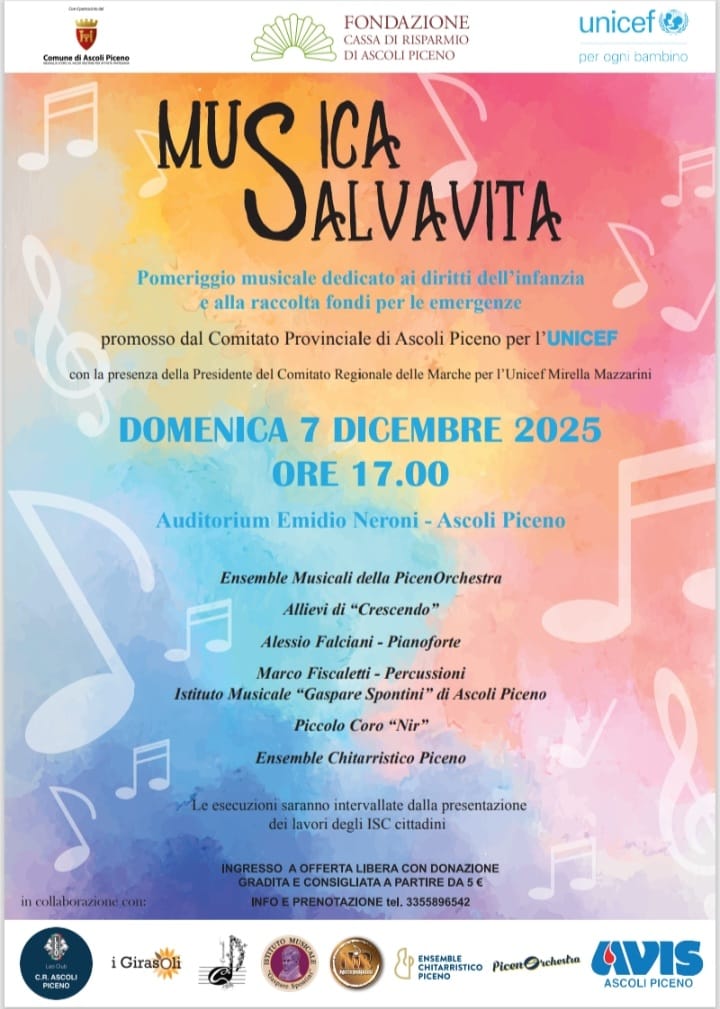 ASCOLI PICENO – Uno spettacolo musicale per sensibilizzare e raccogliere fondi per le campagne di solidarietà contro la malnutrizione dell’infanzia in emergenza nei contesti di guerra: è questa l’iniziativa organizzata dal Comitato Provinciale UNICEF di Ascoli Piceno per Domenica 7 Dicembre, alle ore 17.:00, presso l’Auditorium “Emidio Neroni” nel capoluogo di Provincia.