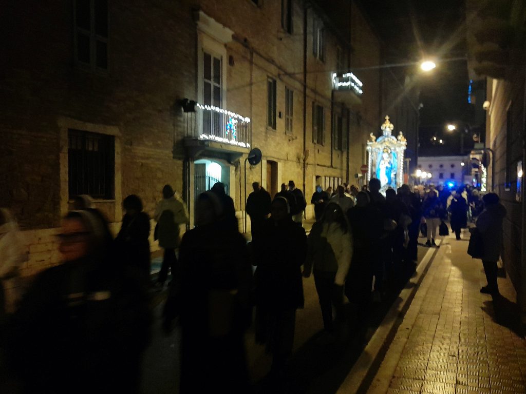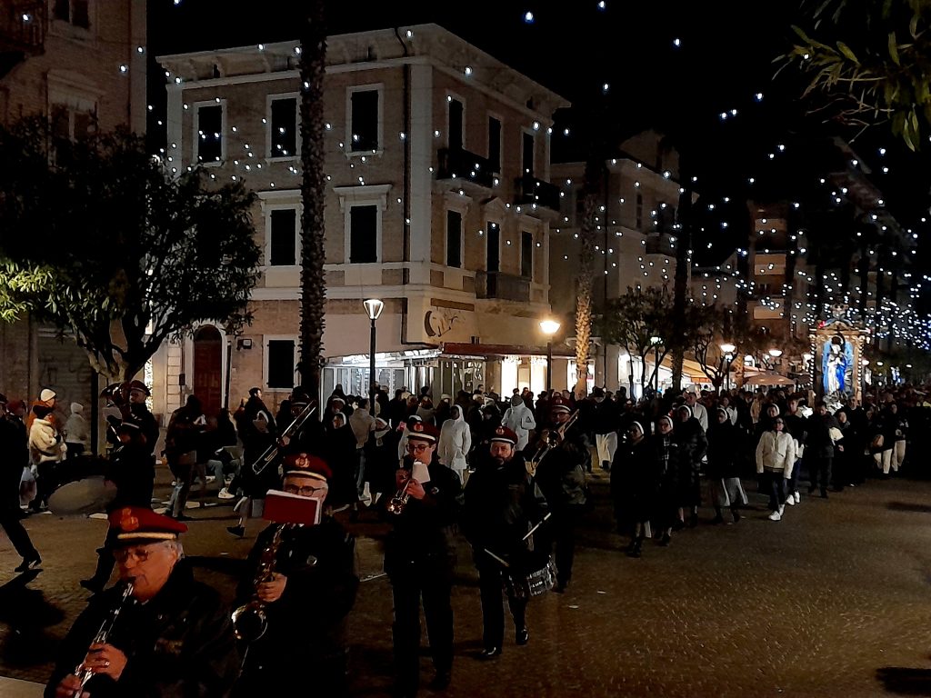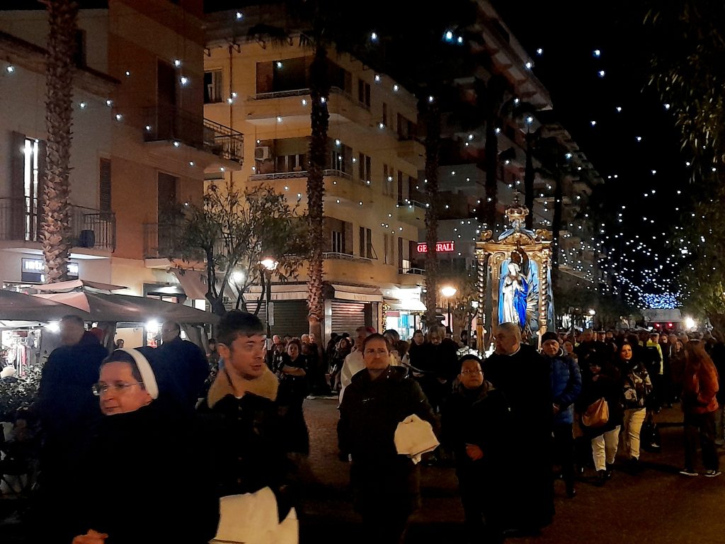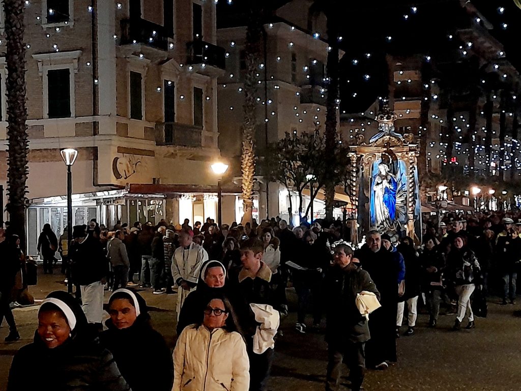 Dopo la Celebrazione Eucaristica, alle ore 18:30, si è tenuta la processione con il simulacro dell’Immacolata per le vie del centro cittadino, un’immagine di rara bellezza e tenerezza, come sottolineato da molti, sia adulti che bambini. Accompagnati dal Corpo Bandistico della Città di San Benedetto del Tronto e dal Coro della cattedrale “Gian Domenico Stella“, i fedeli hanno attraversato prima via Pizzi e poi via Gramsci per giungere al Corso. Qui hanno percorso viale Secondo Moretti, mischiandosi con i cittadini e i turisti presenti, molti dei quali si sono fermati non solo per fotografare e riprendere il numeroso corteo orante, ma anche per unirsi in preghiera. Il cammino è quindi proseguito lungo via XX Settembre, per poi salire verso il Paese Alto, percorrendo via Fileni e via Voltattorni. Arrivati in piazza Sacconi, la statua della Vergine Immacolata è stata fatta rientrata nella chiesa di San Benedetto Martire, dove ad accoglierla c’era una folla numerosa di fedeli.