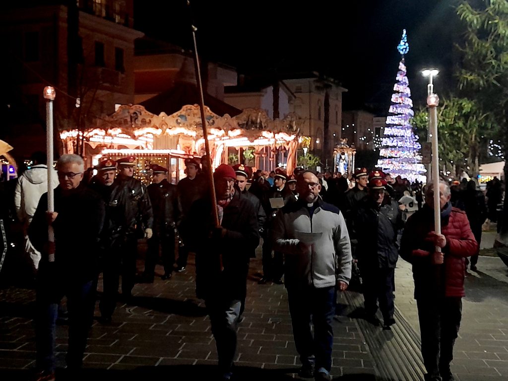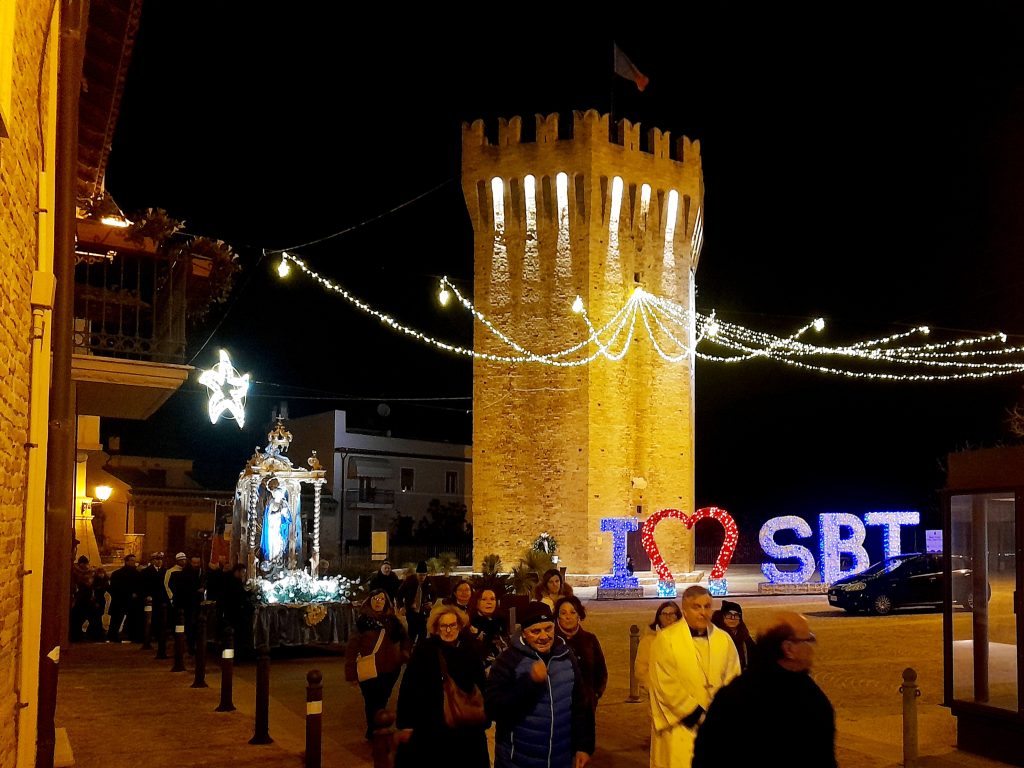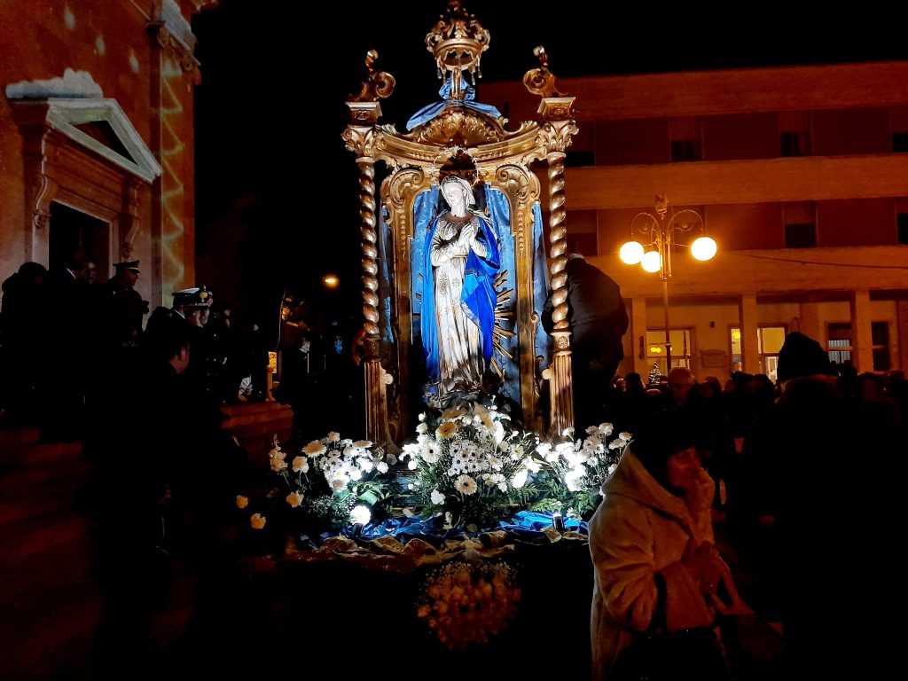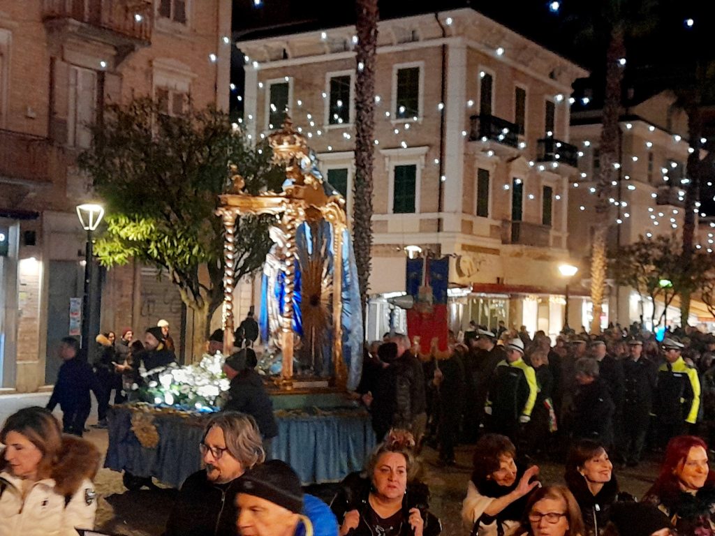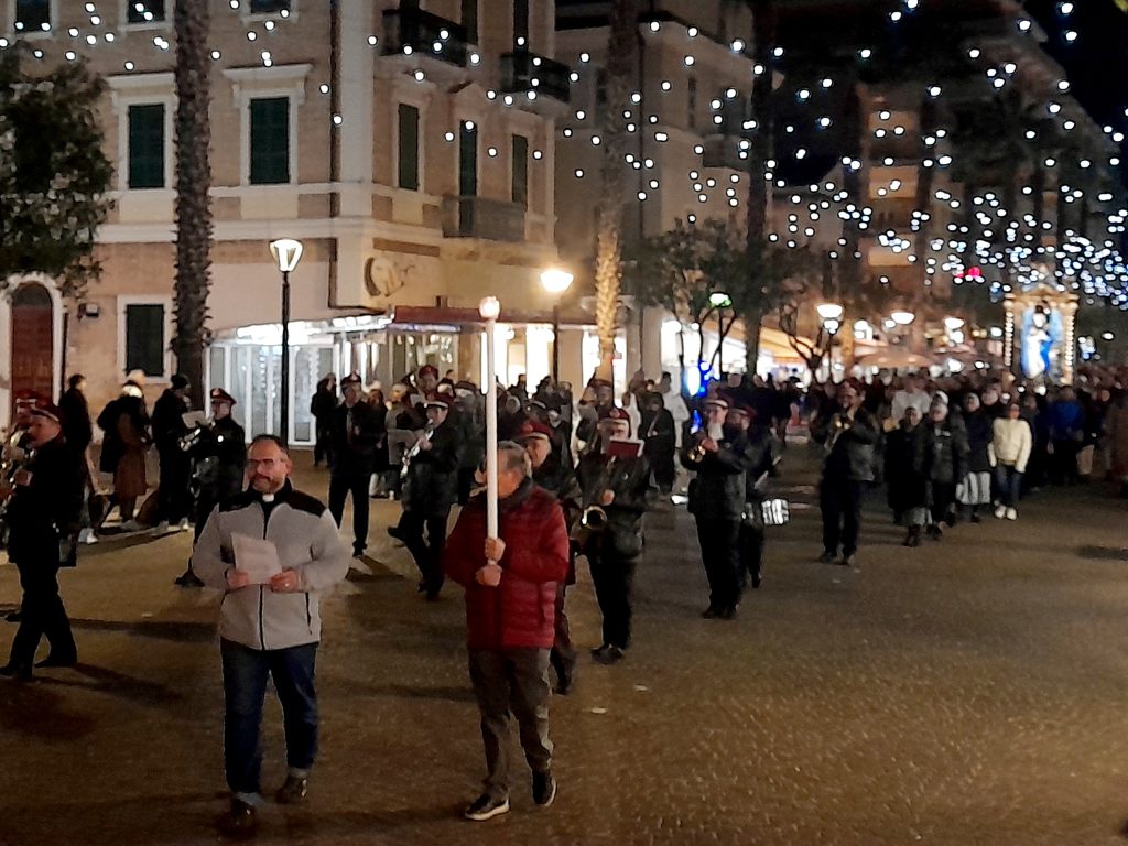 Dopo la Celebrazione Eucaristica, alle ore 18:30, si è tenuta la processione con il simulacro dell’Immacolata per le vie del centro cittadino, un’immagine di rara bellezza e tenerezza, come sottolineato da molti, sia adulti che bambini. Accompagnati dal Corpo Bandistico della Città di San Benedetto del Tronto e dal Coro della cattedrale “Gian Domenico Stella“, i fedeli hanno attraversato prima via Pizzi e poi via Gramsci per giungere al Corso. Qui hanno percorso viale Secondo Moretti, mischiandosi con i cittadini e i turisti presenti, molti dei quali si sono fermati non solo per fotografare e riprendere il numeroso corteo orante, ma anche per unirsi in preghiera. Il cammino è quindi proseguito lungo via XX Settembre, per poi salire verso il Paese Alto, percorrendo via Fileni e via Voltattorni. Arrivati in piazza Sacconi, la statua della Vergine Immacolata è stata fatta rientrata nella chiesa di San Benedetto Martire, dove ad accoglierla c’era una folla numerosa di fedeli.