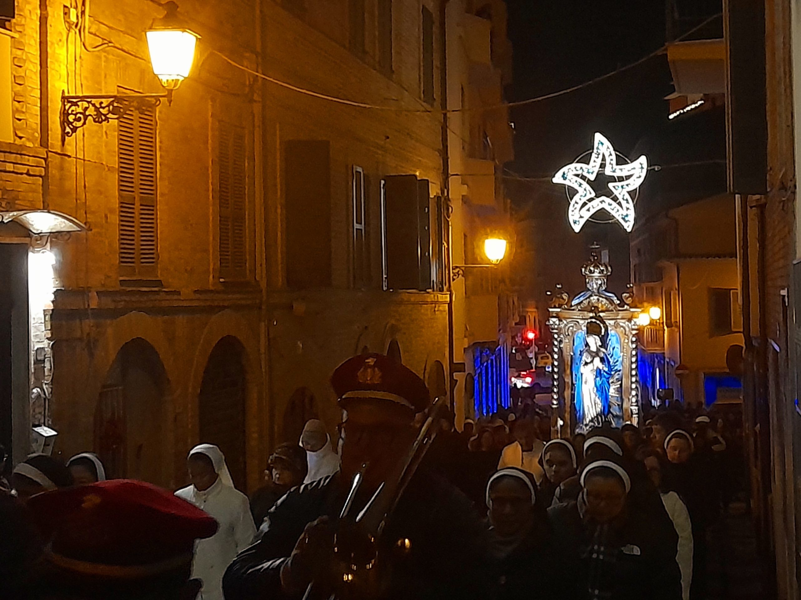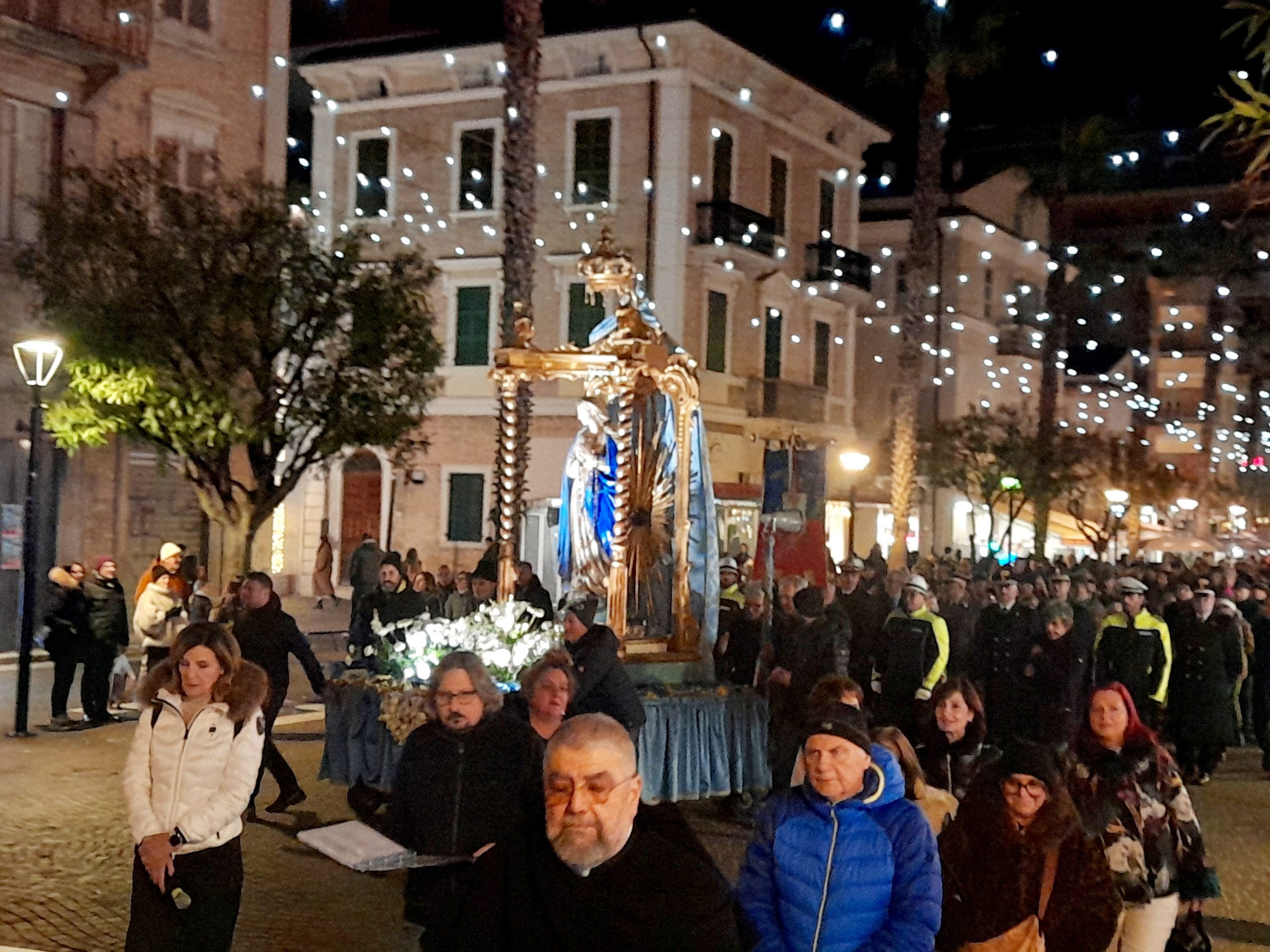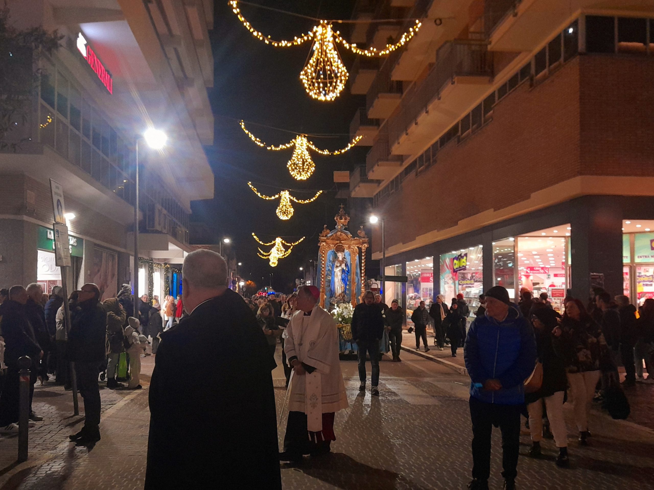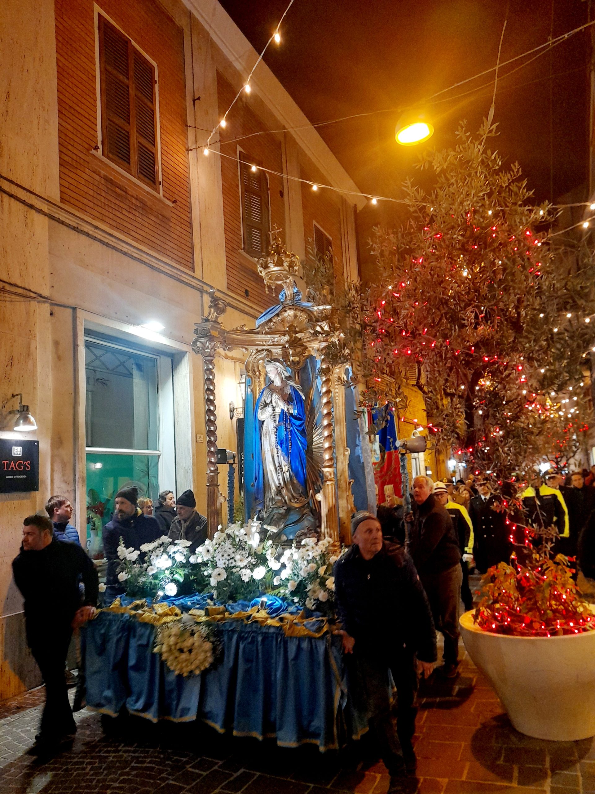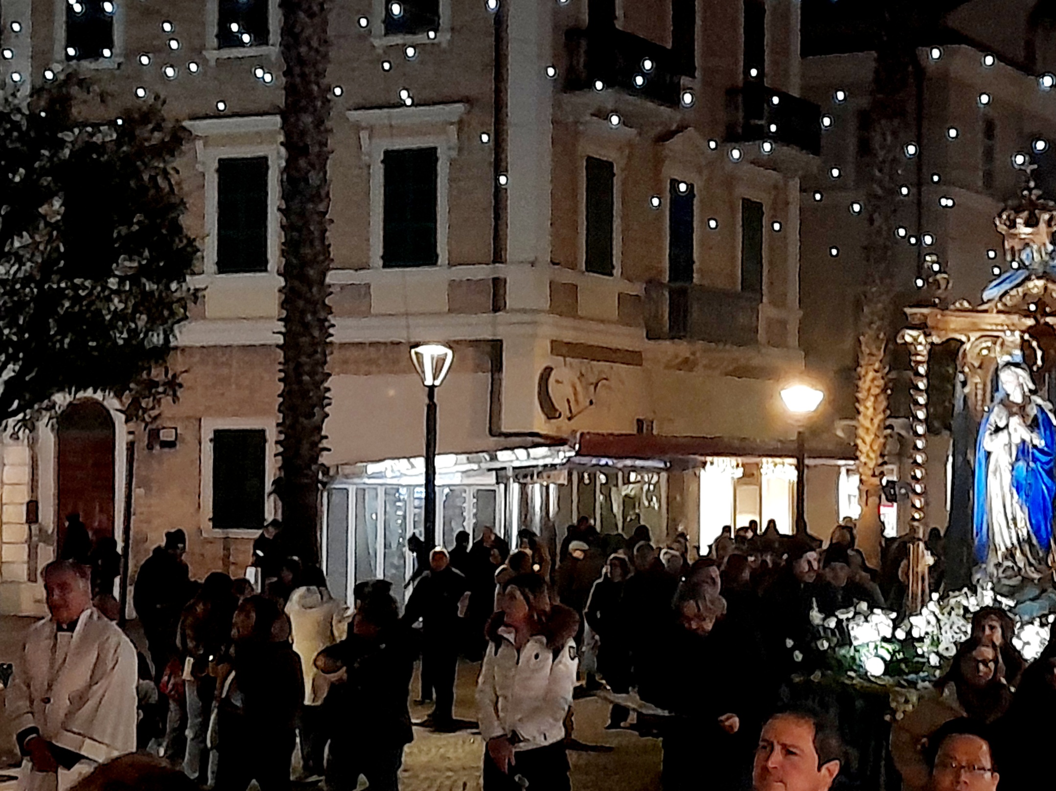 Dopo la Celebrazione Eucaristica, alle ore 18:30, si è tenuta la processione con il simulacro dell’Immacolata per le vie del centro cittadino, un’immagine di rara bellezza e tenerezza, come sottolineato da molti, sia adulti che bambini. Accompagnati dal Corpo Bandistico della Città di San Benedetto del Tronto e dal Coro della cattedrale “Gian Domenico Stella“, i fedeli hanno attraversato prima via Pizzi e poi via Gramsci per giungere al Corso. Qui hanno percorso viale Secondo Moretti, mischiandosi con i cittadini e i turisti presenti, molti dei quali si sono fermati non solo per fotografare e riprendere il numeroso corteo orante, ma anche per unirsi in preghiera. Il cammino è quindi proseguito lungo via XX Settembre, per poi salire verso il Paese Alto, percorrendo via Fileni e via Voltattorni. Arrivati in piazza Sacconi, la statua della Vergine Immacolata è stata fatta rientrata nella chiesa di San Benedetto Martire, dove ad accoglierla c’era una folla numerosa di fedeli.