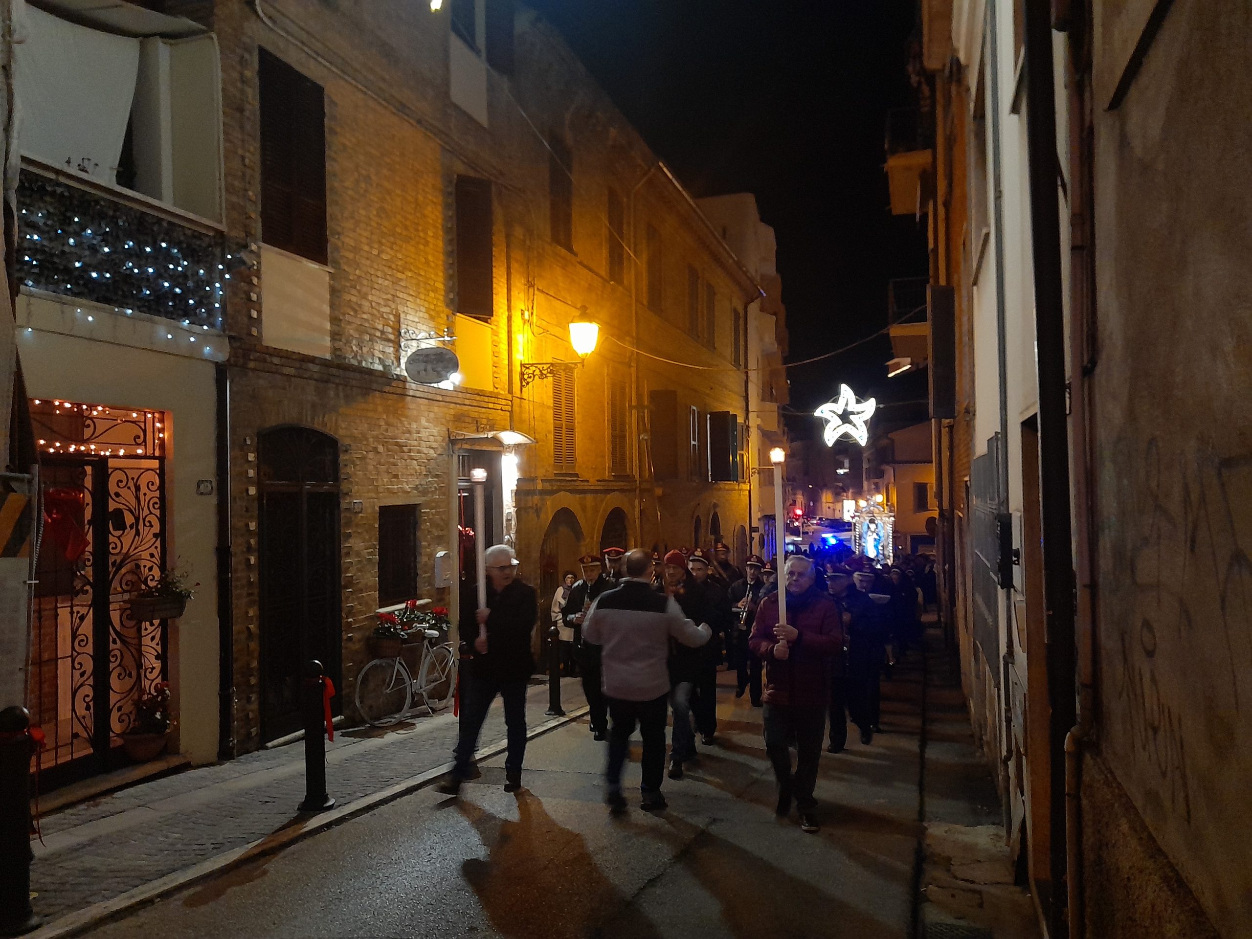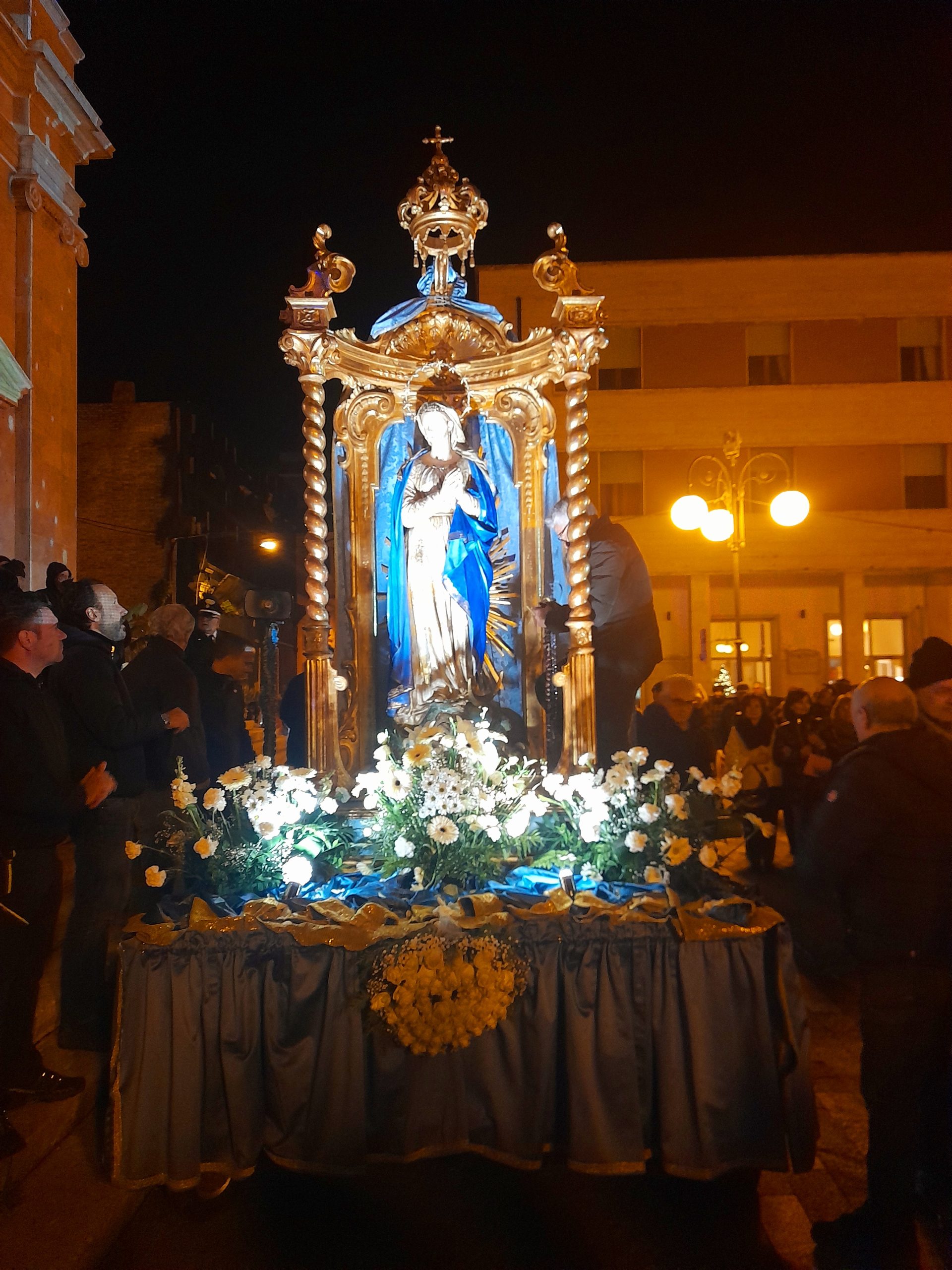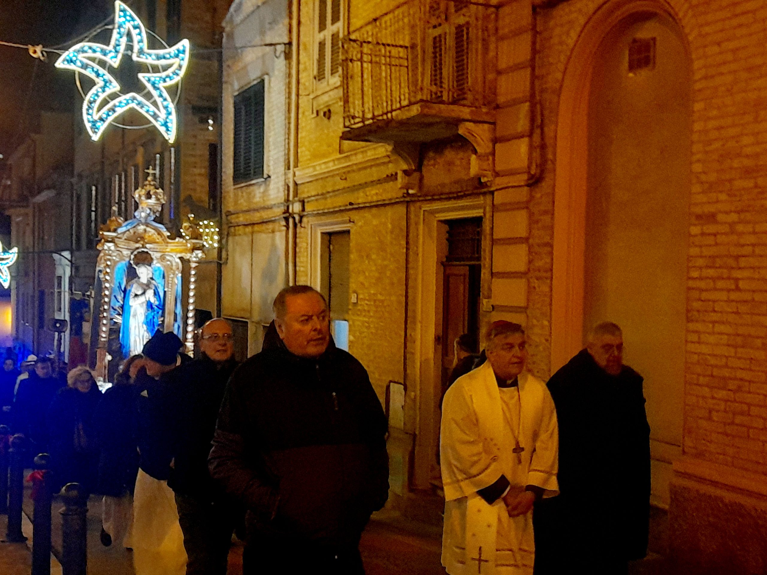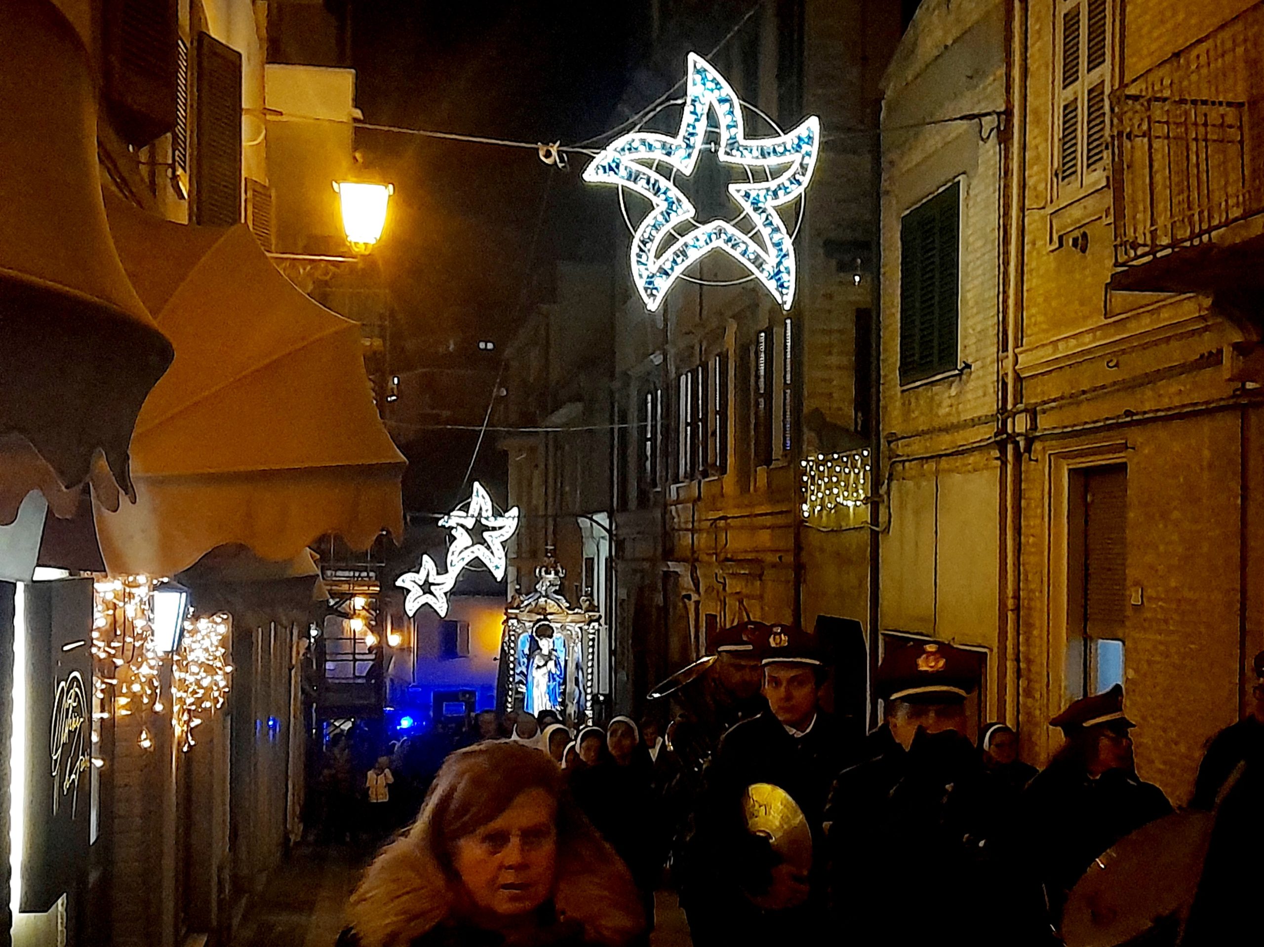 Dopo la Celebrazione Eucaristica, alle ore 18:30, si è tenuta la processione con il simulacro dell’Immacolata per le vie del centro cittadino, un’immagine di rara bellezza e tenerezza, come sottolineato da molti, sia adulti che bambini. Accompagnati dal Corpo Bandistico della Città di San Benedetto del Tronto e dal Coro della cattedrale “Gian Domenico Stella“, i fedeli hanno attraversato prima via Pizzi e poi via Gramsci per giungere al Corso. Qui hanno percorso viale Secondo Moretti, mischiandosi con i cittadini e i turisti presenti, molti dei quali si sono fermati non solo per fotografare e riprendere il numeroso corteo orante, ma anche per unirsi in preghiera. Il cammino è quindi proseguito lungo via XX Settembre, per poi salire verso il Paese Alto, percorrendo via Fileni e via Voltattorni. Arrivati in piazza Sacconi, la statua della Vergine Immacolata è stata fatta rientrata nella chiesa di San Benedetto Martire, dove ad accoglierla c’era una folla numerosa di fedeli.