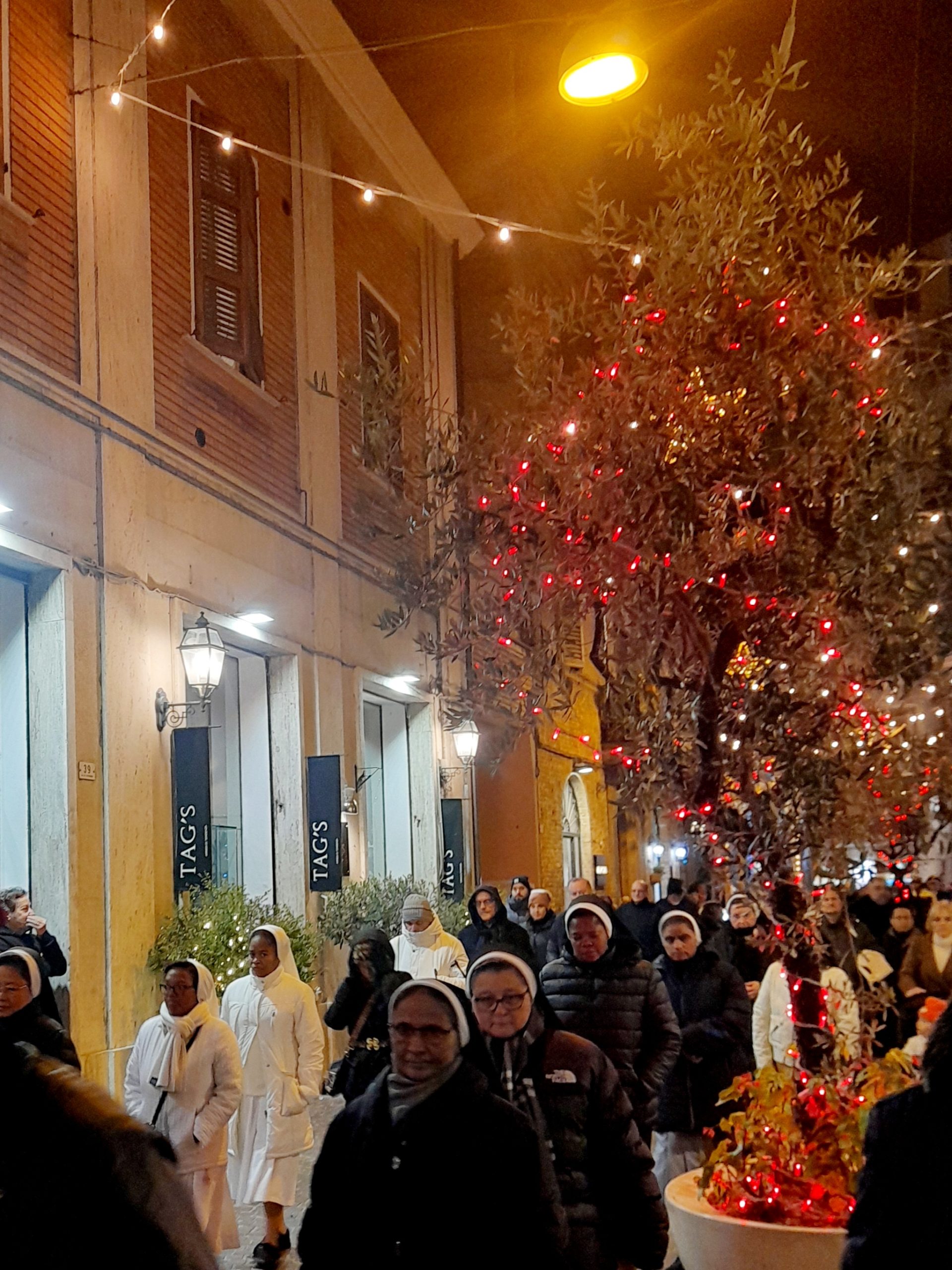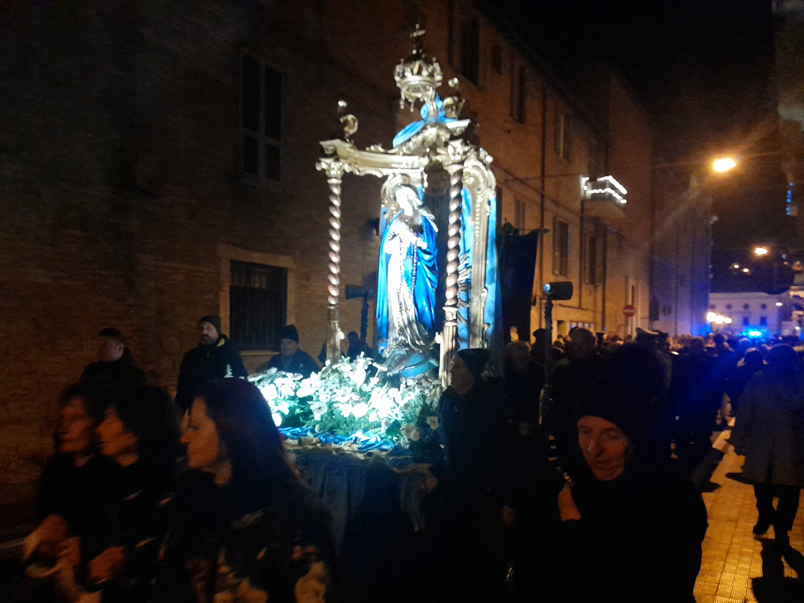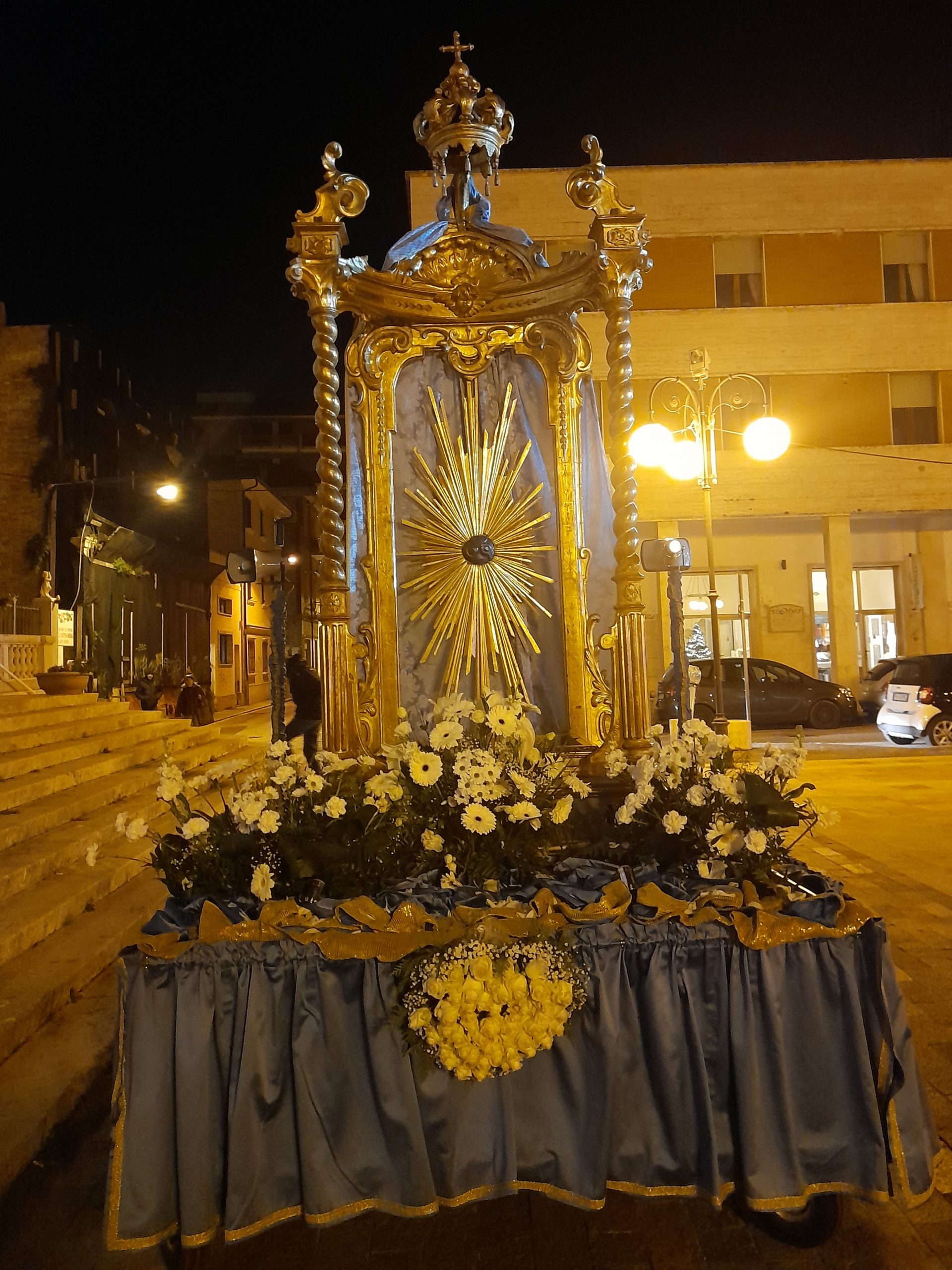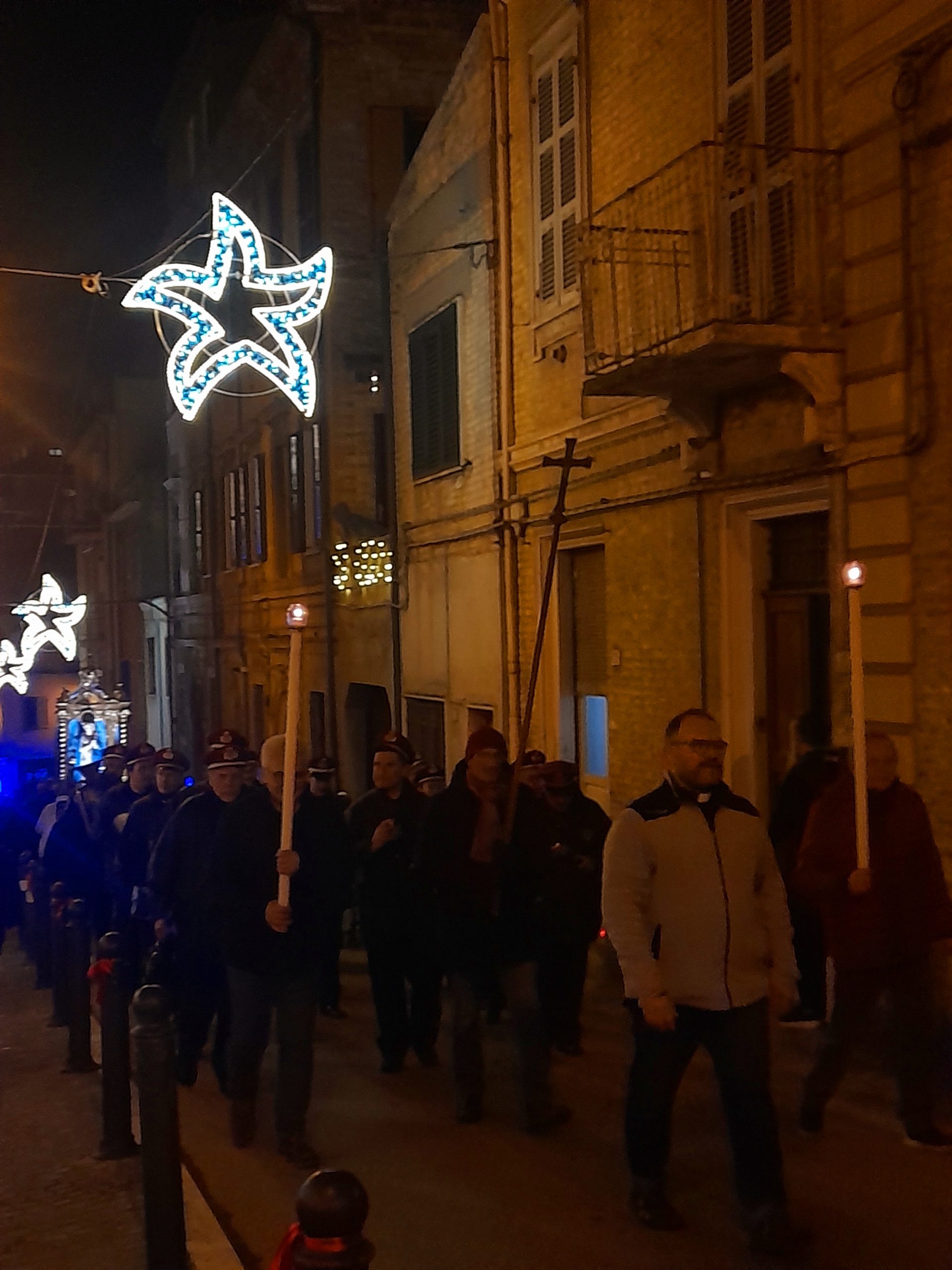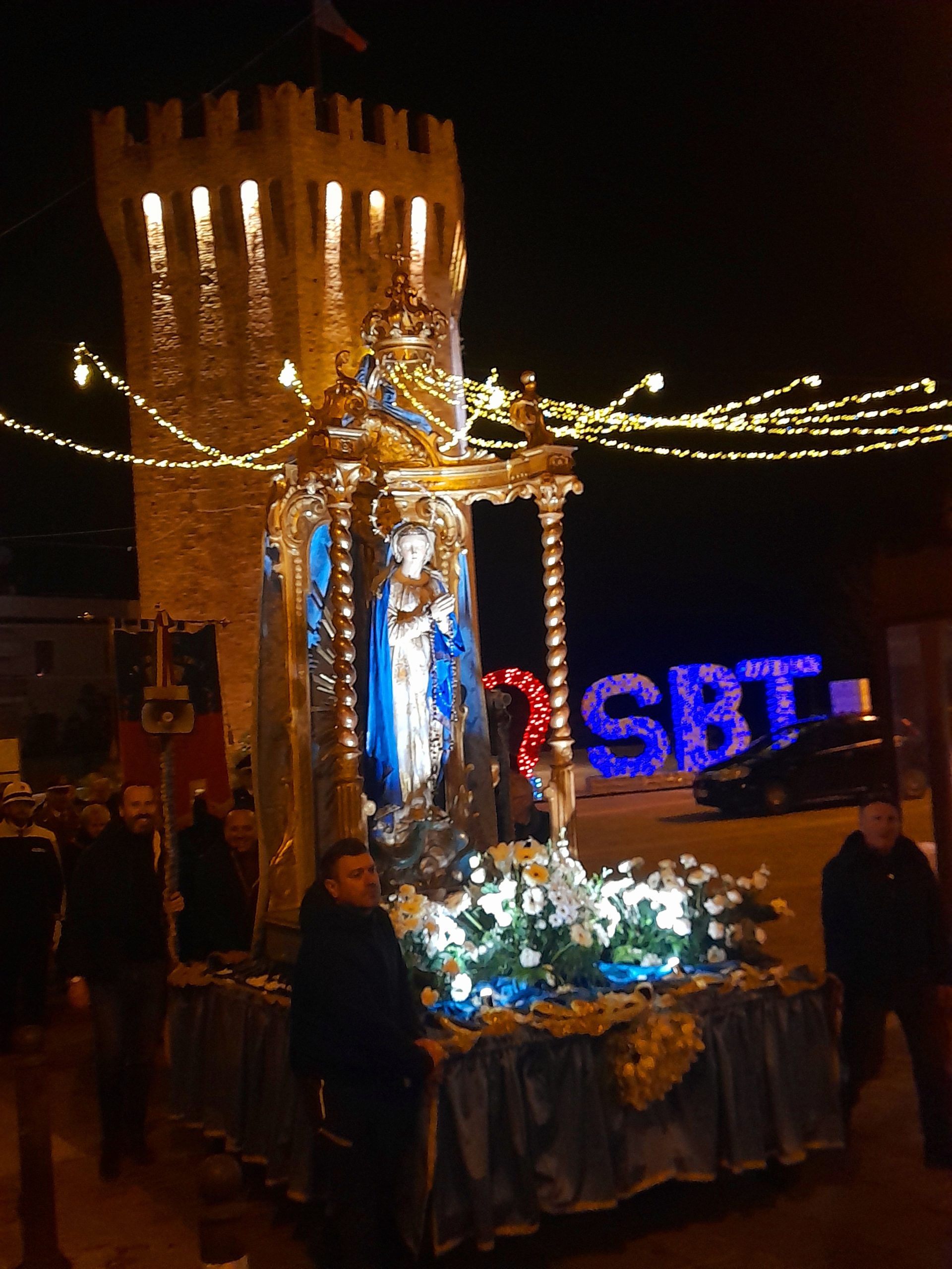 Dopo la Celebrazione Eucaristica, alle ore 18:30, si è tenuta la processione con il simulacro dell’Immacolata per le vie del centro cittadino, un’immagine di rara bellezza e tenerezza, come sottolineato da molti, sia adulti che bambini. Accompagnati dal Corpo Bandistico della Città di San Benedetto del Tronto e dal Coro della cattedrale “Gian Domenico Stella“, i fedeli hanno attraversato prima via Pizzi e poi via Gramsci per giungere al Corso. Qui hanno percorso viale Secondo Moretti, mischiandosi con i cittadini e i turisti presenti, molti dei quali si sono fermati non solo per fotografare e riprendere il numeroso corteo orante, ma anche per unirsi in preghiera. Il cammino è quindi proseguito lungo via XX Settembre, per poi salire verso il Paese Alto, percorrendo via Fileni e via Voltattorni. Arrivati in piazza Sacconi, la statua della Vergine Immacolata è stata fatta rientrata nella chiesa di San Benedetto Martire, dove ad accoglierla c’era una folla numerosa di fedeli.