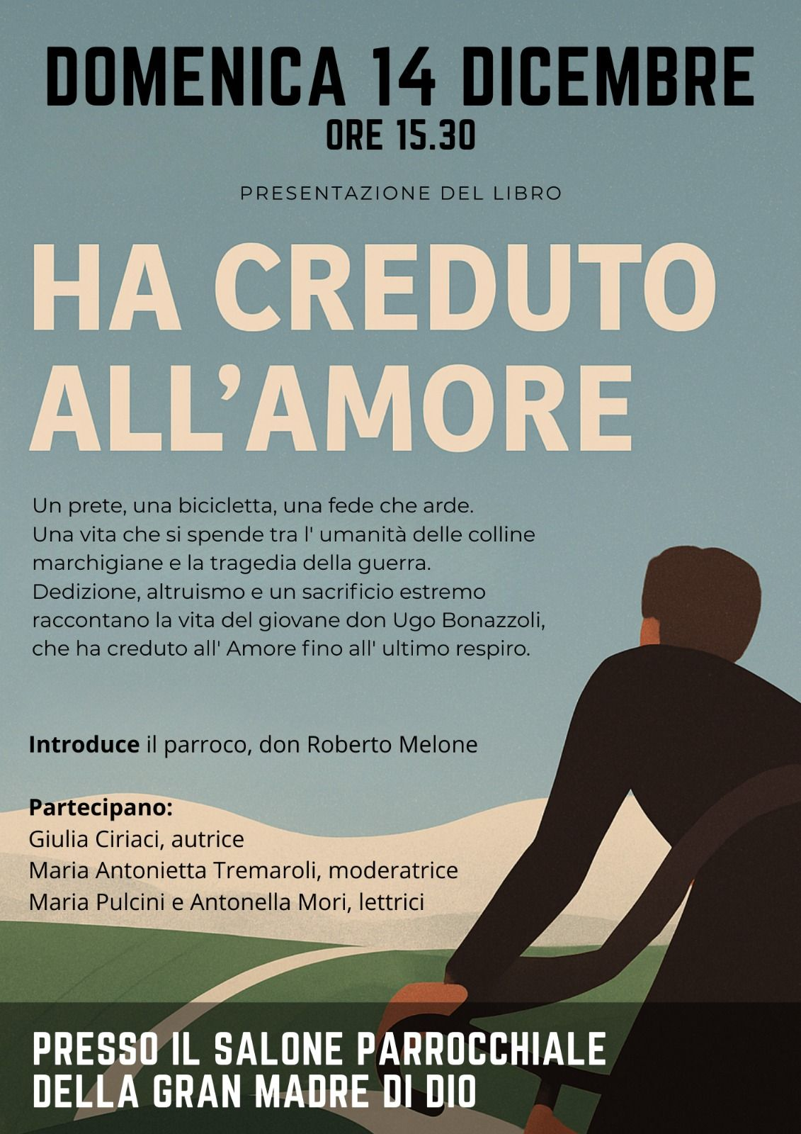 GROTTAMMARE – Domenica 14 dicembre, alle ore 15.30, il salone parrocchiale della Gran Madre di Dio ospiterà la presentazione del libro Ha creduto all’Amore, un’opera che ripercorre la vita intensa e generosa del giovane sacerdote don Ugo Bonazzoli.