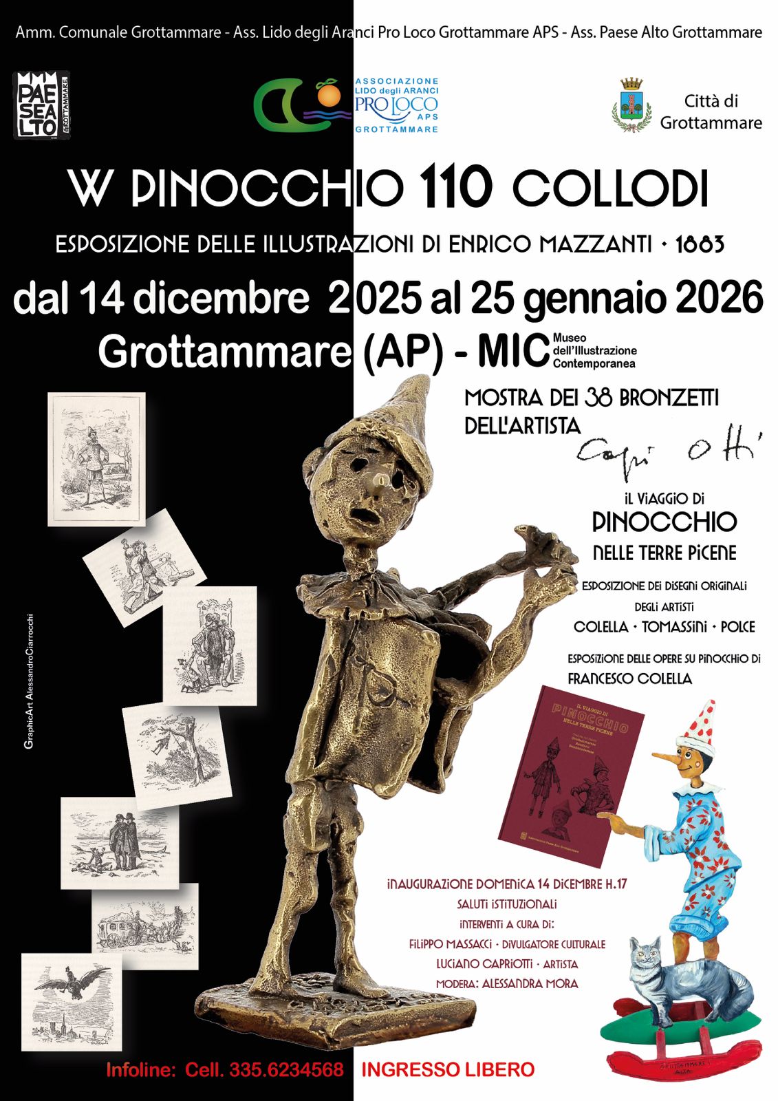 Un connubio tra associazioni che promuove la Cultura a Grottammare e la lettura, questa volta adatta a grandi e piccini, in un’interessante senonché unica mostra da non perdere assolutamente per godere della compagnia di Pinocchio e dei personaggi di Collodi, insieme alle illustrazioni di Mazzanti!
