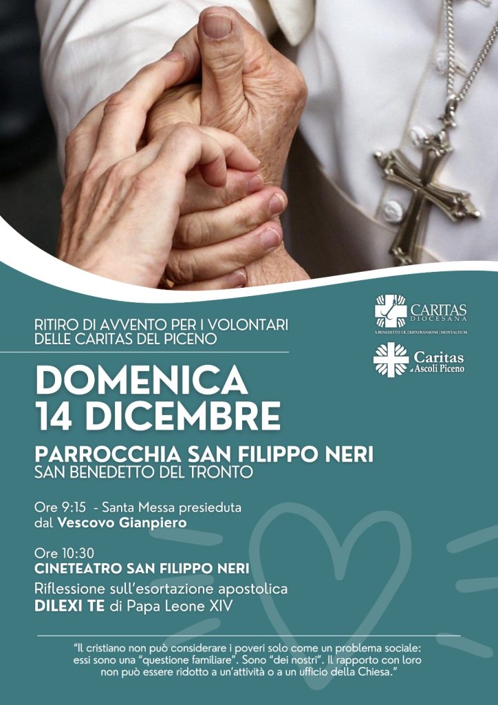 DIOCESI – Domenica 14 dicembre la comunità della Parrocchia San Filippo Neri di San Benedetto del Tronto ospiterà il Ritiro di Avvento dedicato ai volontari delle Caritas del Piceno. Un appuntamento particolarmente atteso, pensato per offrire un momento di preghiera, formazione e riflessione a coloro che, durante tutto l’anno, si dedicano con impegno e discrezione al servizio delle persone più fragili.