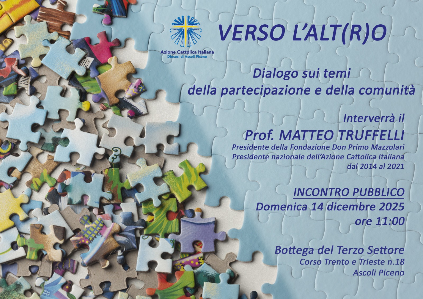 ASCOLI PICENO – “VERSO L’ALT(R)O: è questo gioco di parole, il titolo scelto dall’Azione Cattolica diocesana di Ascoli Piceno, per l’incontro pubblico che ha organizzato sui temi della partecipazione e della comunità.