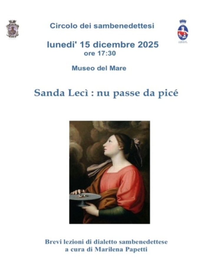 Papetti guiderà il pubblico in un percorso tra storia, mito e religione, intorno al tema della tradizionale festa di Santa Lucia ( 13 Dicembre) a San Benedetto. Non a caso il titolo dell’appuntamento riprende un modo di dire del dialetto locale: “Sanda Lecì : nu passe da pecí”. L’illustre relatrice intende esplorare, attraverso alcune forme dialettali e i significati popolari della festa, l’importanza che la fiera e il mondo cittadino hanno sempre dato a questo avvenimento nel tempo.